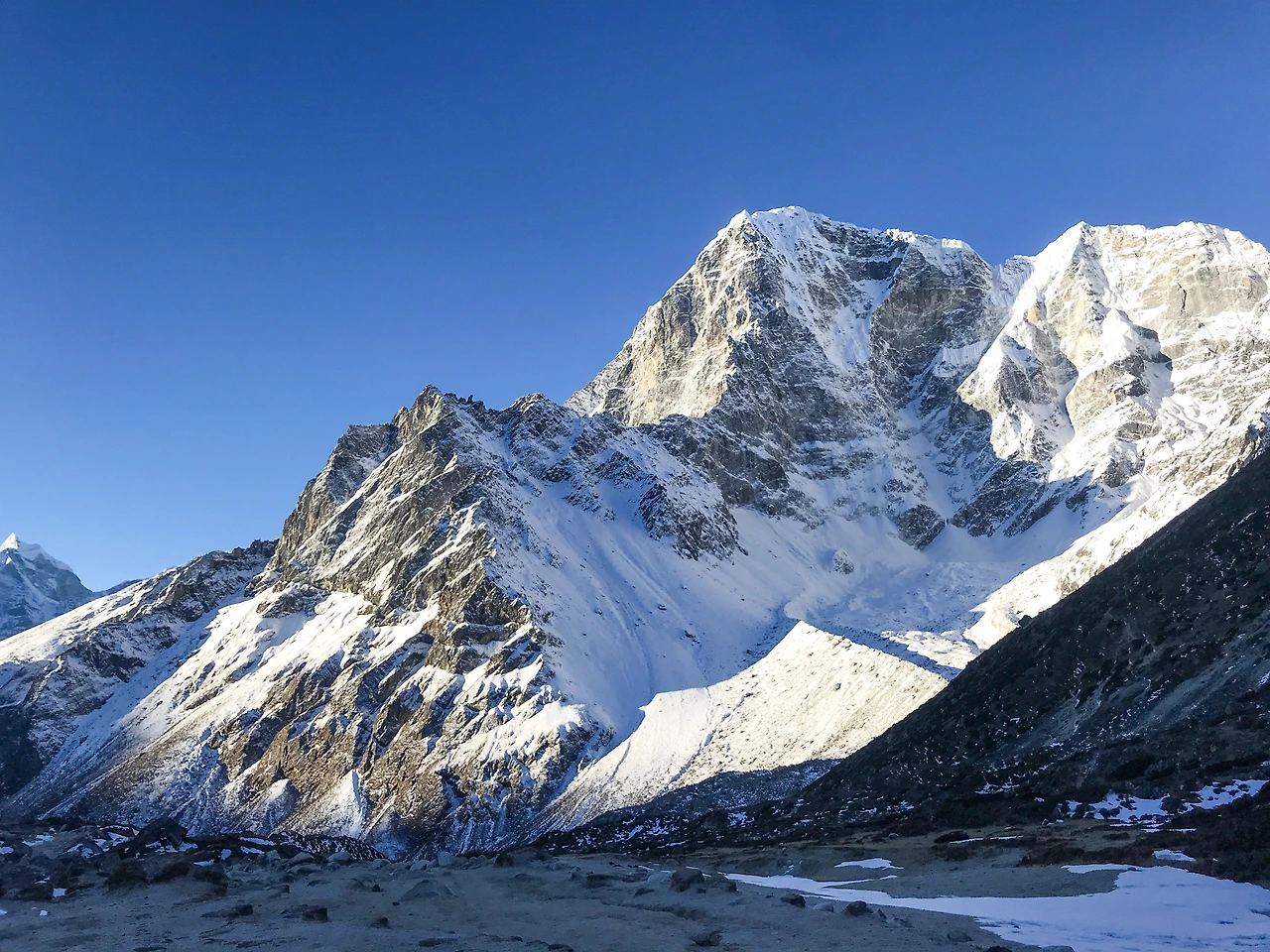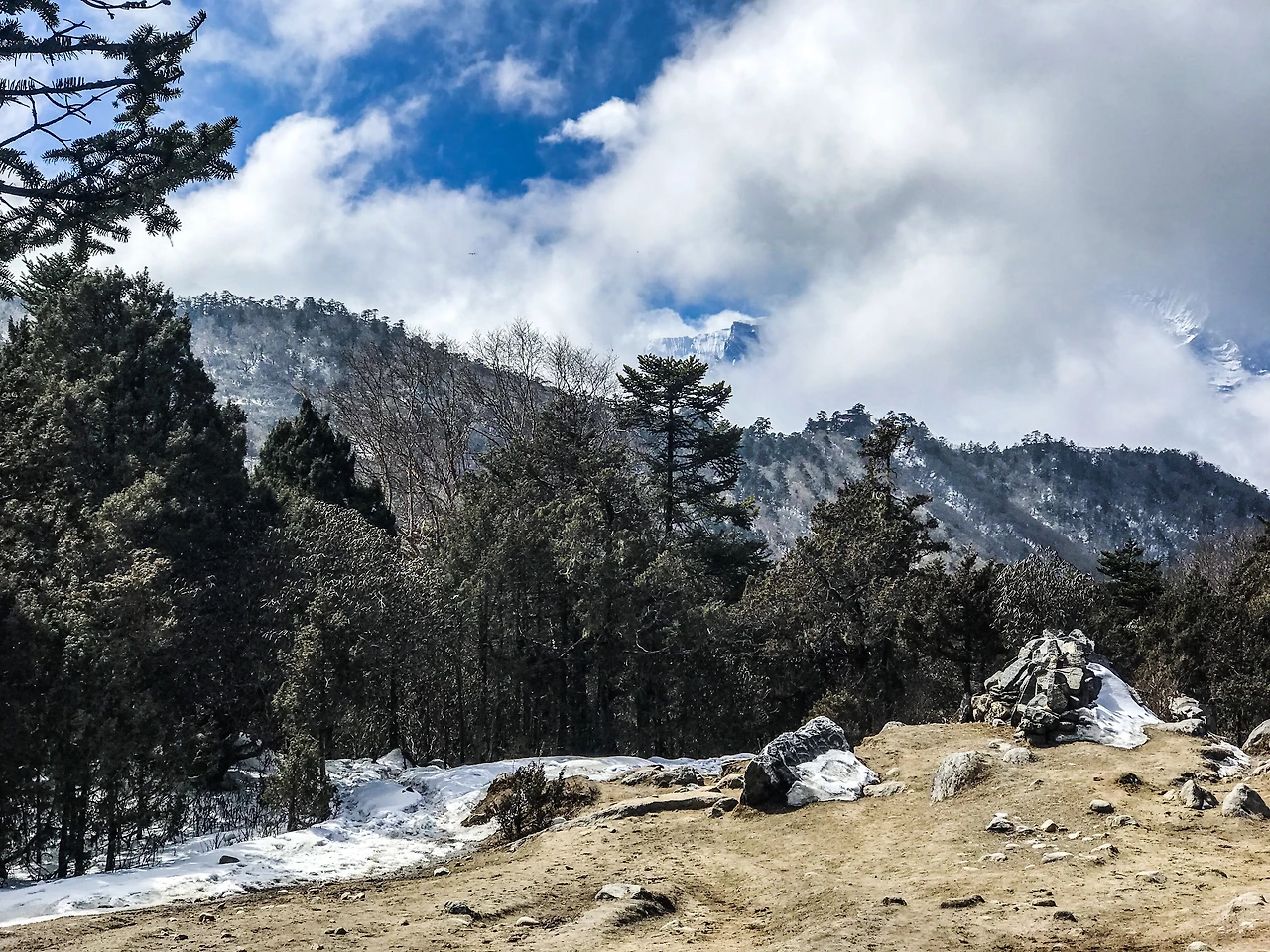 샌드위치 하나로 굶주린 배만 채우고 가던 길을 재촉했다. '팡보체'를 지나 절벽에 난 길을 따라 걷다가 '데보체'로 가기 위해 내리막길을 걸었다. 주변에 나무가 많은 탓인지 눈이 그대로 쌓여있었고, 꽤나 미끄러웠다.
