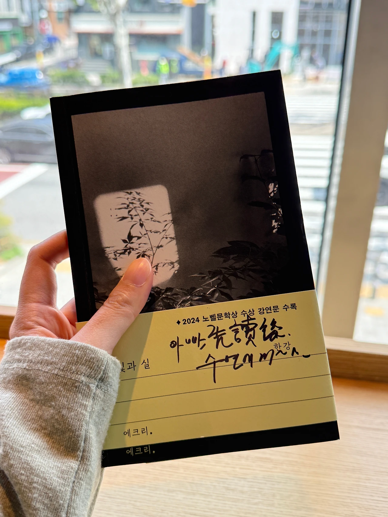 한강 작가님의 강연문, 시, 에세이 등을 엮은 <빛과 실>이라는 책이었다. 그도 그럴게 요즘 아빠는 한강 작가님의 작품을 몰아서 읽는 것에 빠져있었다. 아빠가 먼저 다 읽은 후 나도 읽으라고 두신 것 같았다. 나는 한동안 그 책을 물끄러미 바라봤다. 이 책을 책상에 두고 서서 주섬주섬 네임펜을 찾아 뚜껑을 열고 띠지에 메모를 하는 아빠가 머릿속에 그려졌다. ‘선독 후’는 꼭 한자로 쓴 후에 뿌듯해하는 모습도 머릿속에서 상영되듯이, 눈에 선했다.