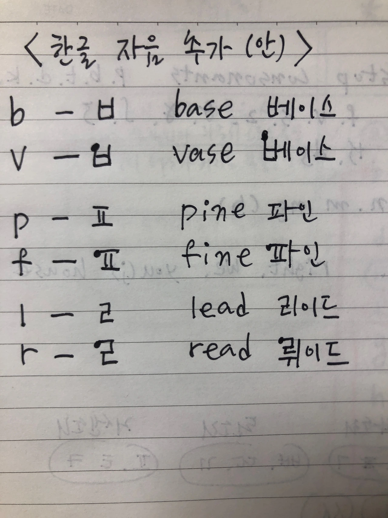 2) 영어의 파열음 p의 소히는 한글의 파열음 자음 ㅍ으로 옮긴다. 영어의 마찰음 f의 소리에 해당하는 한글 자음은 없으므로 새로 추가해야 한다.
