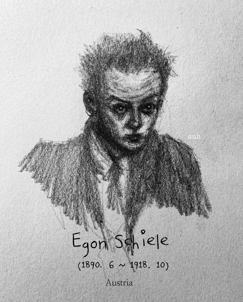 에곤 쉴레의 드로잉을 따라 그려보다가 도저히 흉내조차 낼 수 없음을 깨닫고 그냥 그의 얼굴을 그린다. 에곤 쉴레가 어느 편지에 썼다는 저 말은, 나르시시즘에 빠진 예술가의 자아도취적 발언이 아니라 자신의 길에 들어선 것을 확실히 알고 있는 사람의 자부심으로 읽힌다.