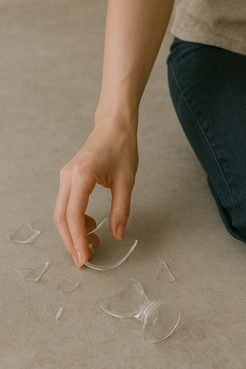 바닥에 쪼그려 앉아 흩어진 유리 조각을 치우기 시작했다.