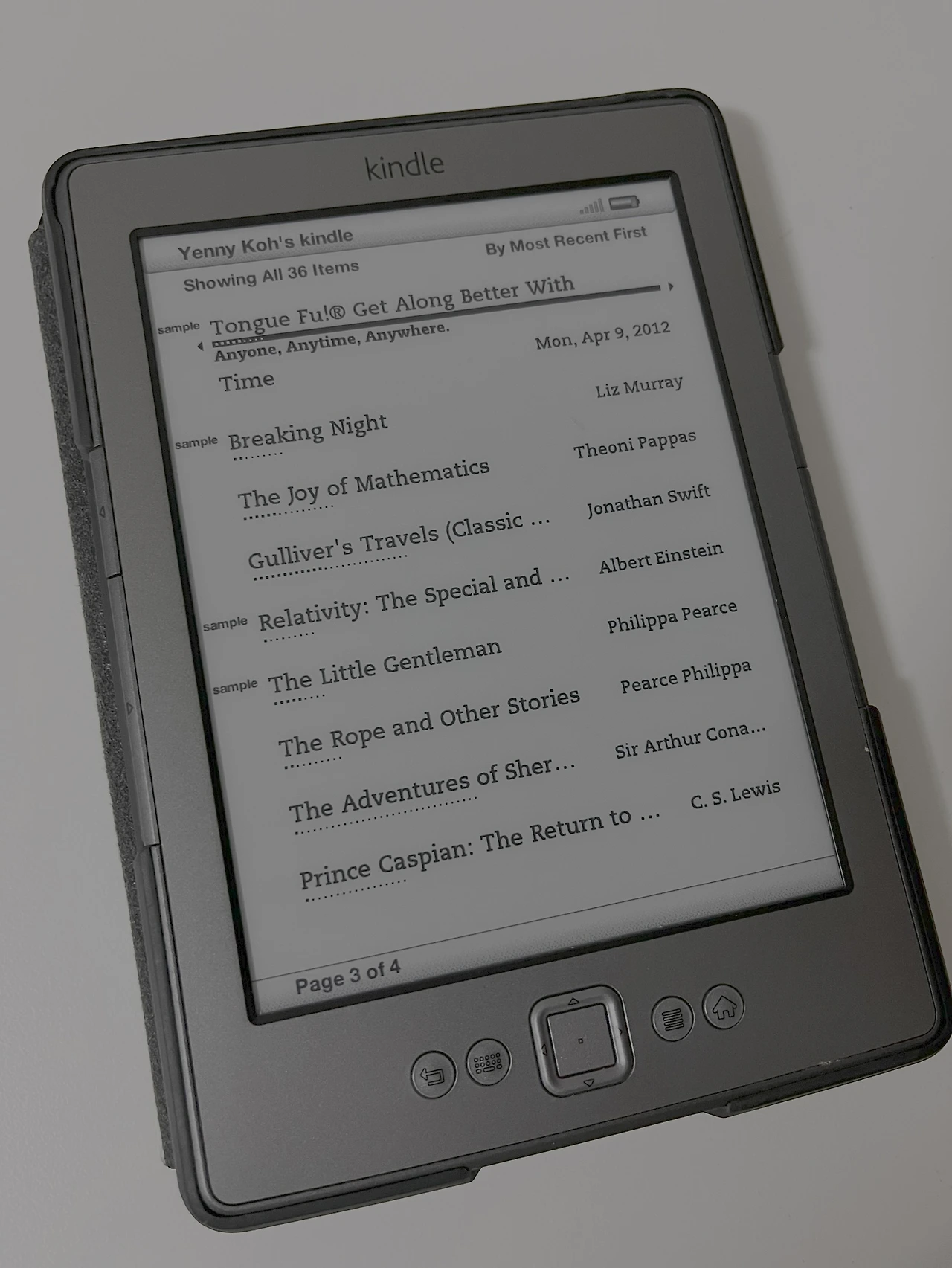 (터치 기능조차 없어 화살표 키로 타자를 쳐야 하는 나의 구닥다리 Kindle을 소개한다. 여태 망가지지 않고 잘 살아 있지만, 서비스 지원이 종료되어 이제는 사용할 수 없다. 물론 나는 그 뒤로 터치가 되는 멋진 이북리더기를 새로 샀다.)