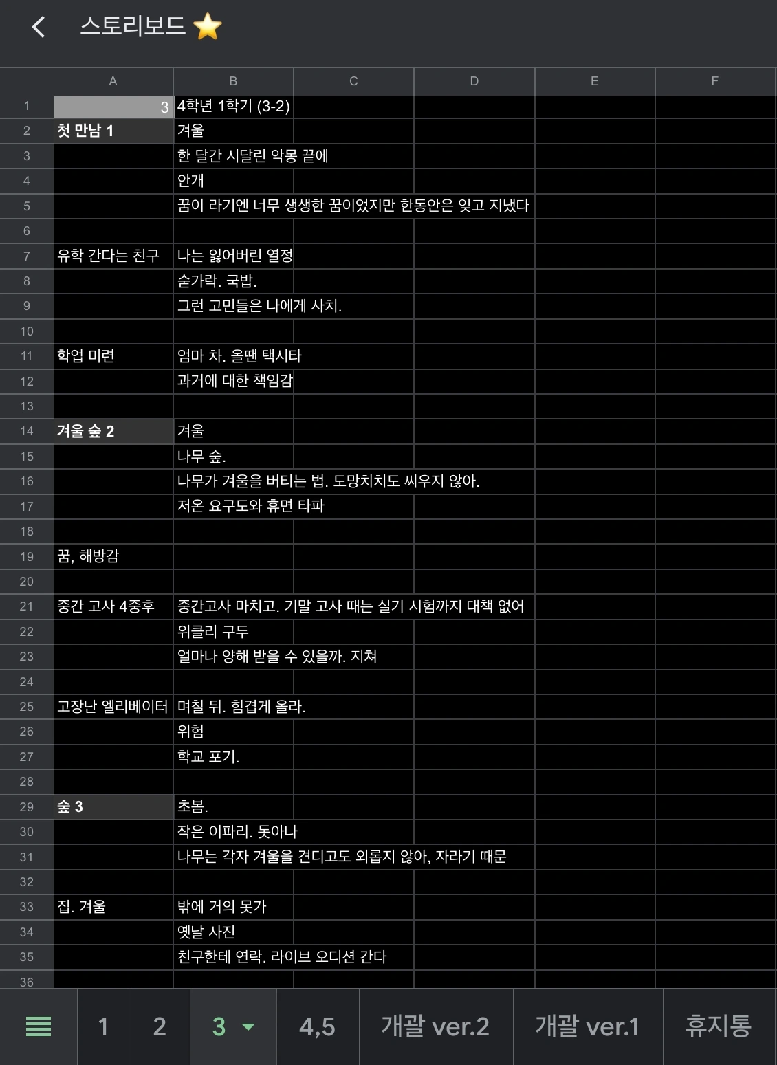 나만 알아볼 수 있는 최소한의 타이핑으로 스토리보드를 만들었다.