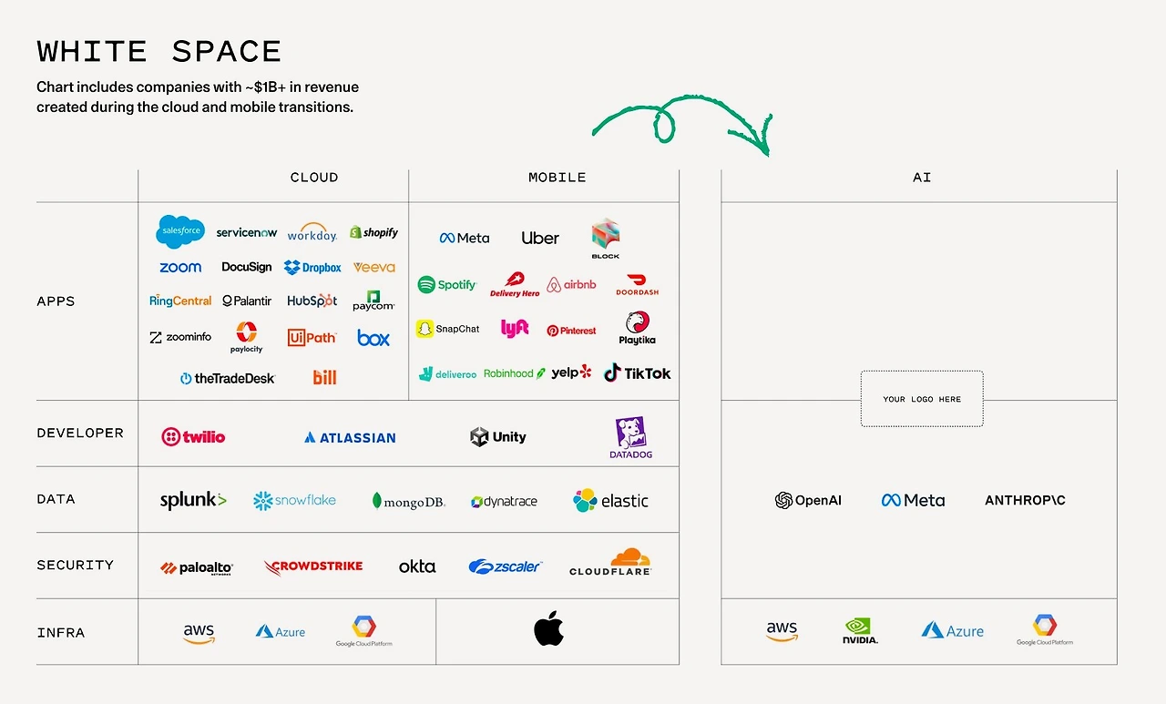 벤처 자본가들에게 가장 흥미로운 레이어다. 클라우드 전환 과정에서 10억 달러 이상의 매출을 기록한 애플리케이션 레이어 기업이 약 20개, 모바일 전환 과정에서는 약 20개가 탄생했으며, AI 전환기에도 비슷한 일이 일어날 것으로 보인다.