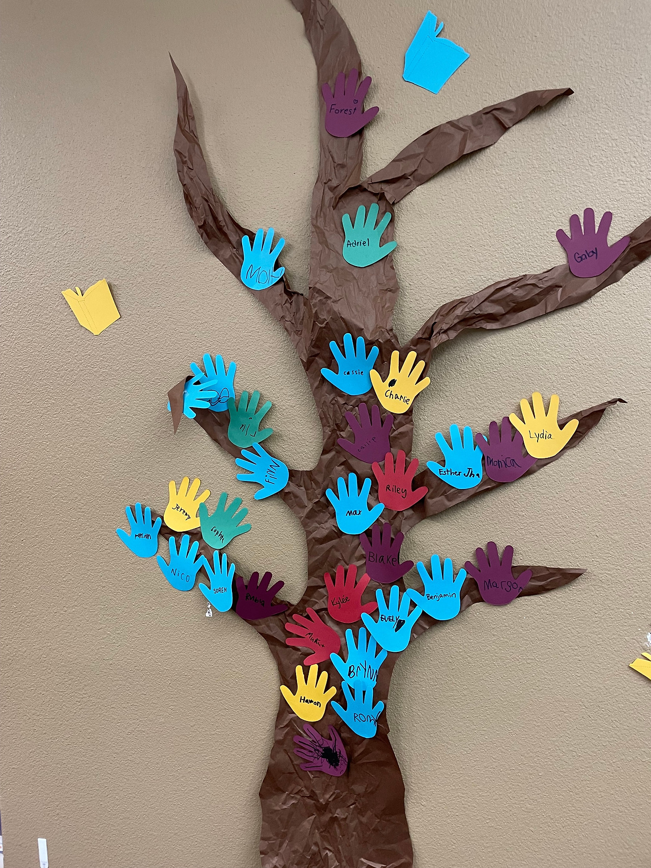 도서관에서 진행하는 'Growing Tree' 프로젝트가 있었다. 아이들이 여름 시작할 때 자기 손바닥을 색종이에 대고 그려서 이름을 쓴 뒤, 큰 나무 줄기에 붙이는 것이다. 그리고 여름이 끝날 때 다시 한 번 손바닥을 그려서 붙인다.