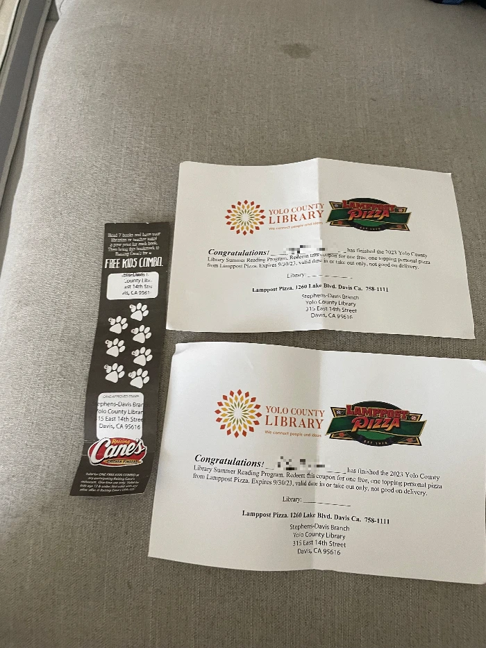 "Summer Reading Program에 참여하시겠어요? 아이가 책을 빌려 읽으면 찍어주는 도장을 모으면, 배지와 보상을 드려요. 이번 보상은 무려 Raising Cane's Chicken Fingers라구요!"