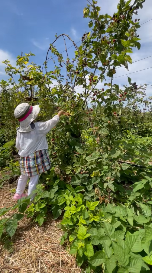 블루베리 구역으로 이동하니 엘리의 손이 더 바빠졌다. 하나는 바구니에, 하나는 입에. 어느새 입 주변이 보라색으로 물들었다.