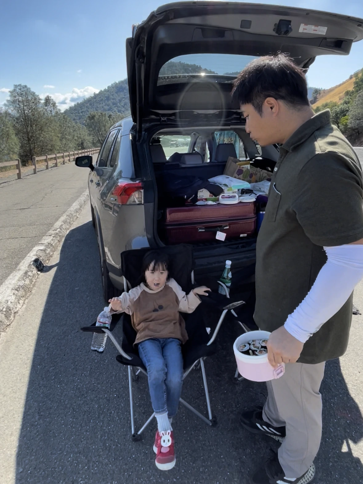 결국 중간에 잭슨빌(Jacksonville) 근처의 비스타 포인트에 차를 세웠다. 설명을 읽어보니 잭슨빌은 댐을 만들면서 수몰된 골드러시 시대의 마을이었다고. 트렁크에서 접이식 캠핑 의자를 꺼내고, 아이스박스에서 김밥을 꺼냈다.