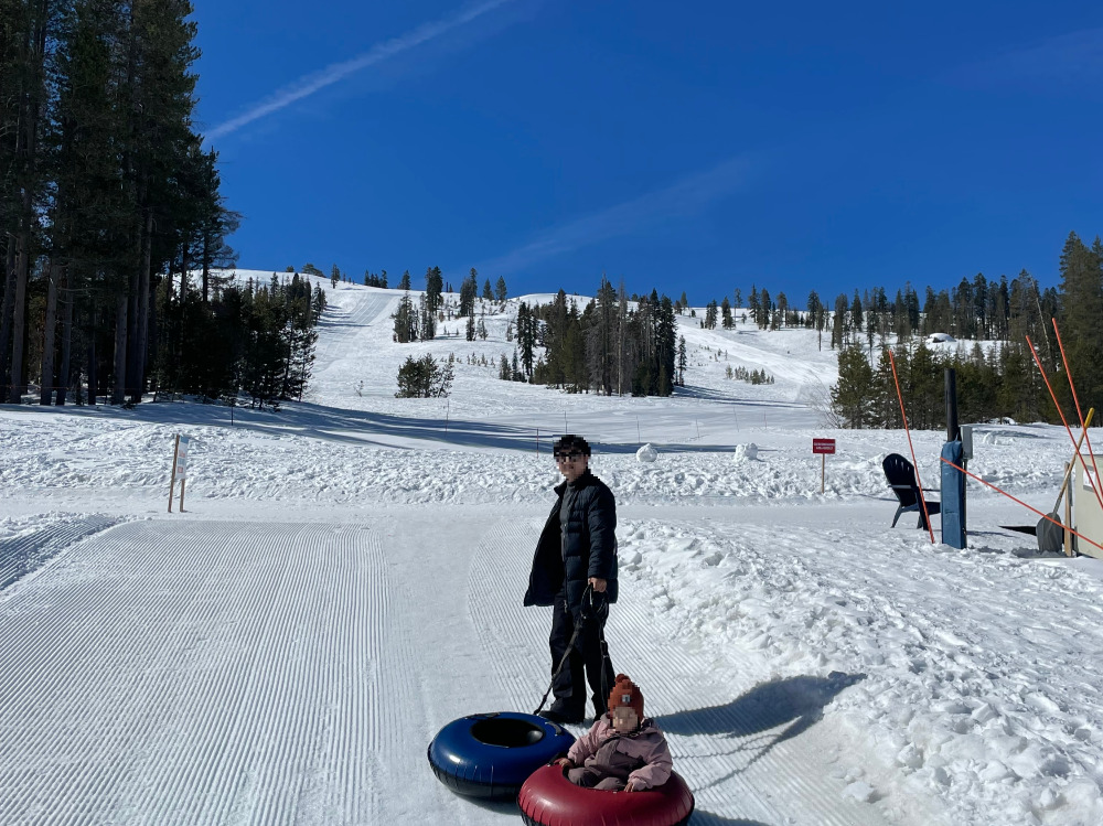 타호에서의 둘째 날 아침, 호텔에서 조식을 든든하게 먹은 후 소다 스프링스(Soda Springs)로 향했다. 3월이라는 사실이 무색하게, 아침 공기는 영하로 뚝 떨어져 있었다. 엘리는 드디어 눈을 만지고 마음껏 놀 수 있다는 생각에 흥분을 감추지 못했다. 소다 스프링스는 우리가 묵던 호텔에서 차로 15분 거리에 있었는데, 막상 가보니 규모가 그리 크지 않은 스키장 옆에 아이들을 위해 눈썰매장을 같이 운영하고 있는 소형 리조트였다. 오기 전에 미리 예약해 둔 터라 기다리지 않고 바로 pass card를 받을 수 있었다.
