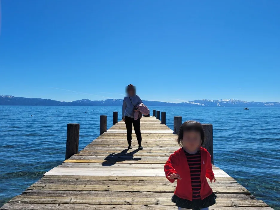 여행 마지막 날, 우리는 데이비스로 돌아가기 전 다시 한번 타호 호수를 눈에 담기로 했다. 이번 목적지는 타호 시티(Tahoe City). 첫날 저녁의 고요한 모습과는 달리, 대낮의 햇살을 받은 호수는 훨씬 더 웅장하고 깊은 푸른빛을 뽐내고 있었다. 바닥에는 화강암 돌멩이들이 너울너울 비치고, 먼 호수 쪽에는 파란 하늘을 거울처럼 비췄다. 햇살은 강렬하고 공기는 맑았다. 중간중간 산자락에 흰색 머플러가 감겨 있고 먼 하늘에는 비행운이 직선을 그리고 있다. 이 순간, 이 장면이 내 가슴에 박혀서 여운이 쉽사리 가시지 않았다. 이 글을 쓰는 지금까지도 나를 설레게 하는 Lake Tahoe, Jewel of the Sierra. 정말 보석 같은 호수다.