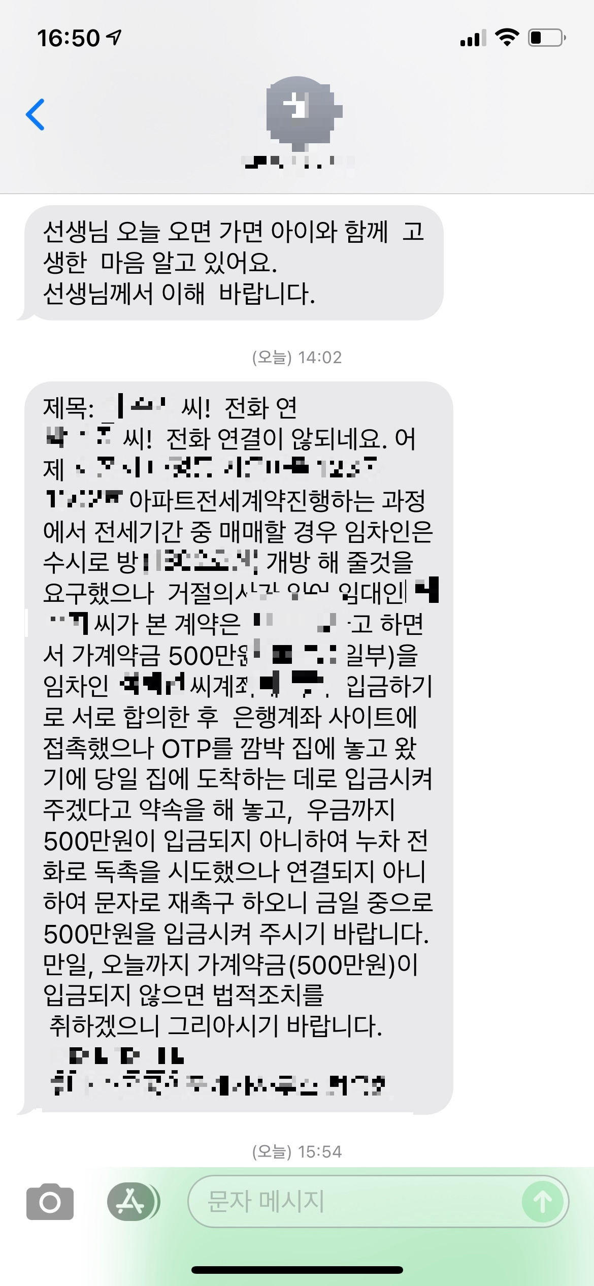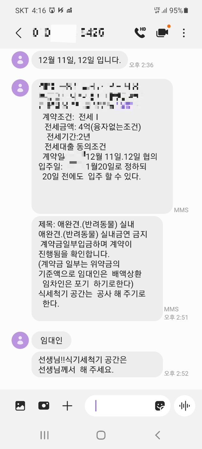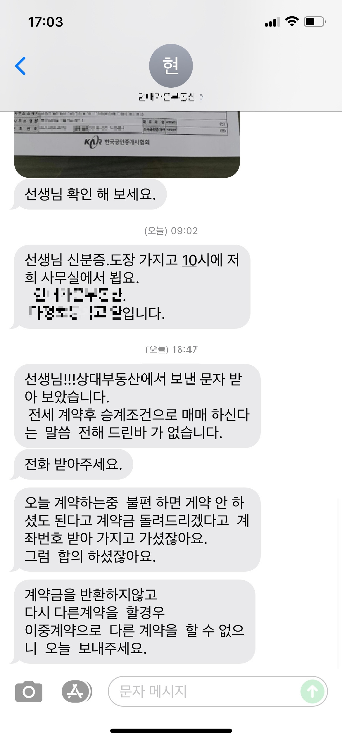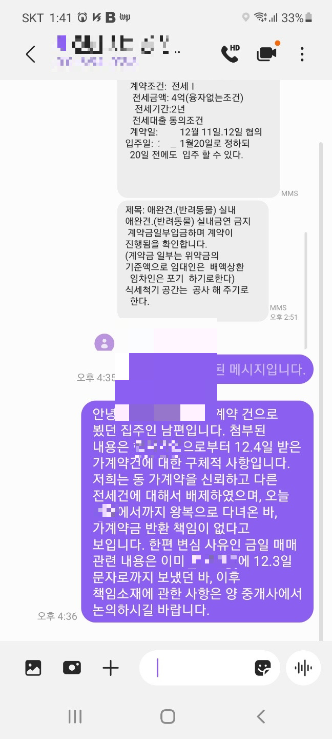 나는 H부동산 사장을 쳐다봤다. 분명 '전세 기간 중 매매 가능성'에 대해 세입자에게 확인해 달라고 여러 번 부탁했었다. 문자로도 증거가 남아 있었다. 그런데 그걸 빌미로 계약을 파투 낸다는 게 이해가 되지 않았다. 그런데 이상하게도 상대방 중개인은 가만히 있는데 H부동산 사장이 더 적극적으로 상대방에 찬동한다.