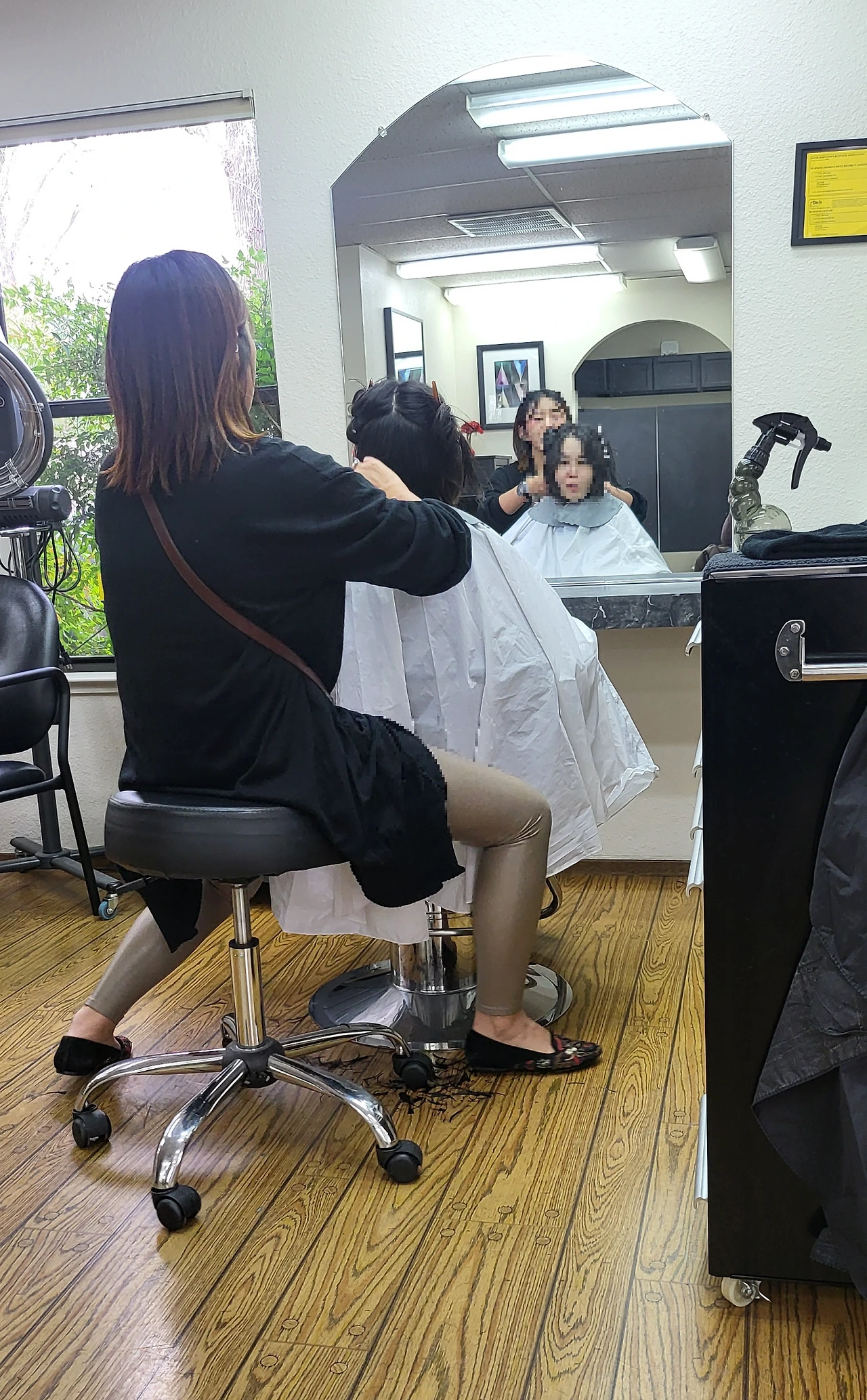 작은 욕조 속에 스툴 의자를 집어넣고 남편을 앉혔다. 상당히 비좁았지만 머리카락이 사방팔방 날리는 걸 막기 위해서는 어쩔 수 없는 선택이었다. 비닐 커버를 목둘레까지 꼼꼼히 두르고 나니 제법 그럴싸한 모양새가 나왔다. 거울에 비친 우리의 모습이 마치 진짜 미용실 같았다.