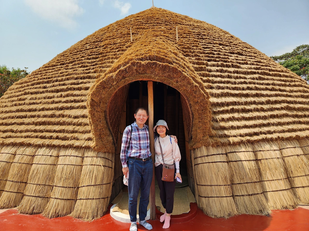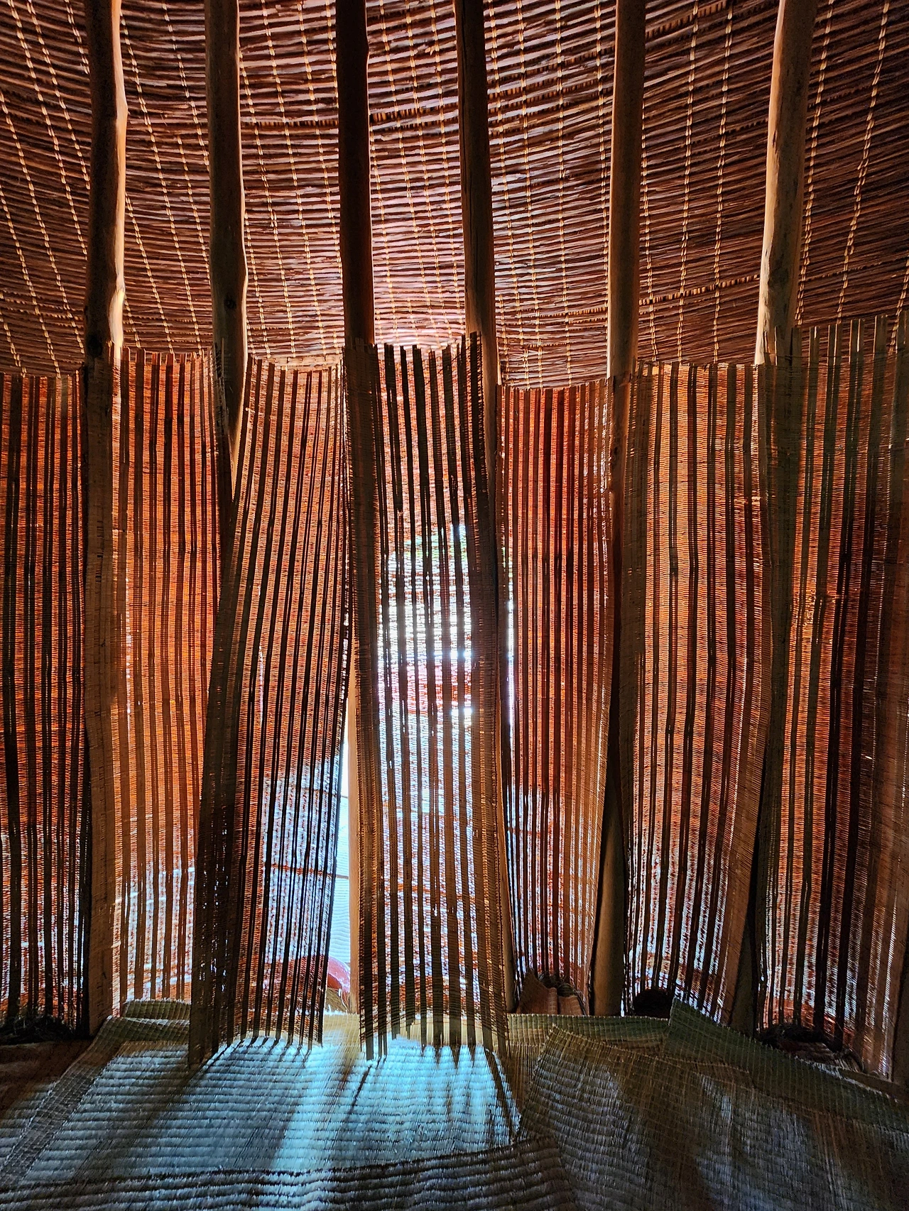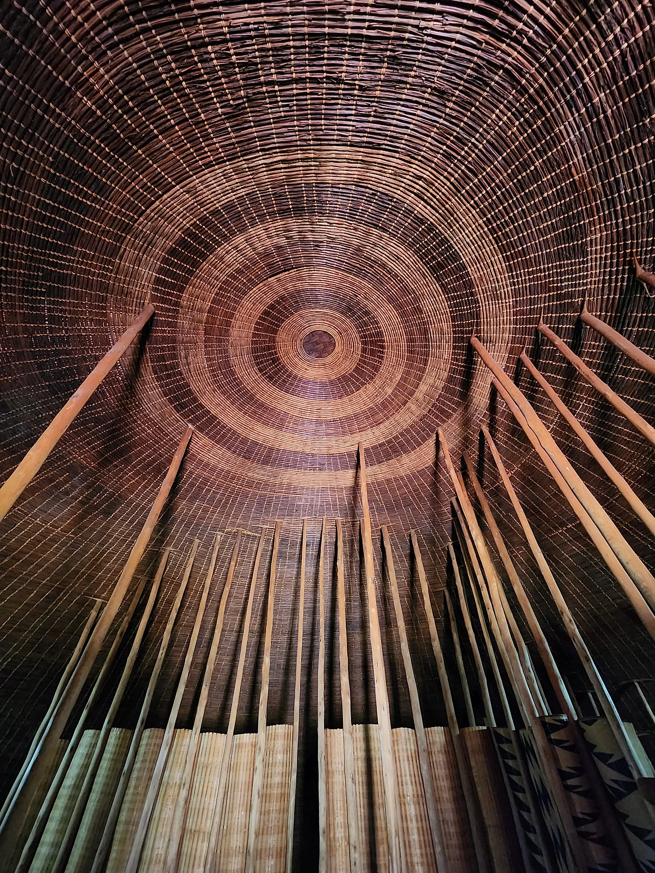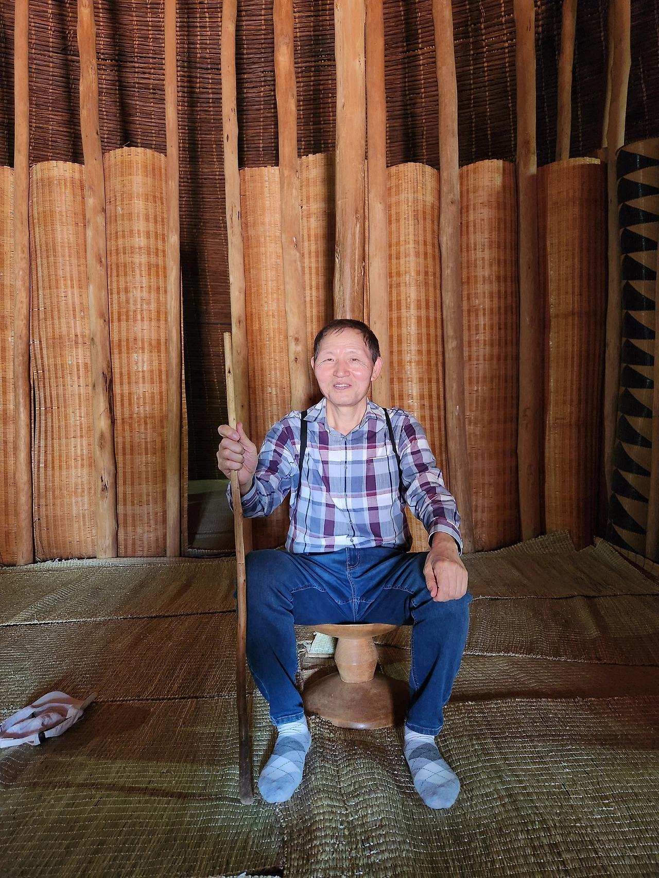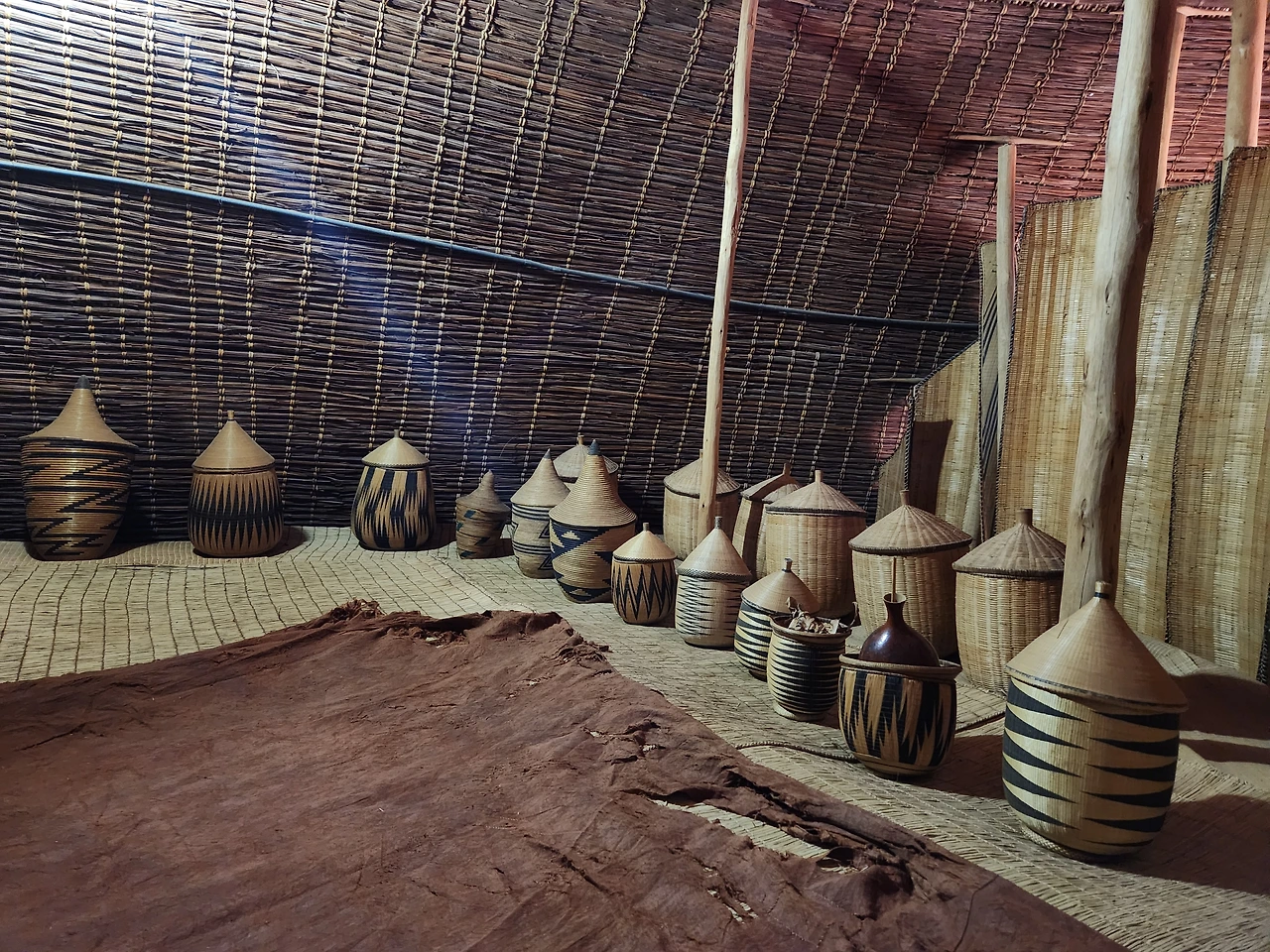 으로 들어가니 제법 서늘하고 통풍도 잘 된다. 왕이 안에서 밖을 내다볼 수 있도록 대나무로 짜인 창문이 만들어져 있는데 이 틈으로 적당히 볕이 들어온다. 중앙에는 회의장소인 듯하고 한쪽에는 침실이 있고 르완다의 독특한 문양으로 짜인 발이 쳐있다. 그 옆으로는 작은 바구니가 즐비하다. 이것은 르완다 전통 가구로 주로 옷이나 물품 등을 보관하는 장소다. 르완다 관광을 하다 보면 가장 많이 볼 수 있는 기념품 중 하나인데 볼 때마다 느끼는 것은 바구니에 짜 넣은 문양이 돋보인다는 것이다. 매우 세련되기도 하고 고급진 것들이 꽤 많다. 그 옛적에 어떻게 이런 무늬를 생각했을까! 할 정도로 말이다. 왕이 앉는 자리에 떡하니 앉아있는 남편, 가이드가 건네준 긴 막대를 들고 앉아있는 모습이 은근히 잘 어울리지 않는가~~!!!