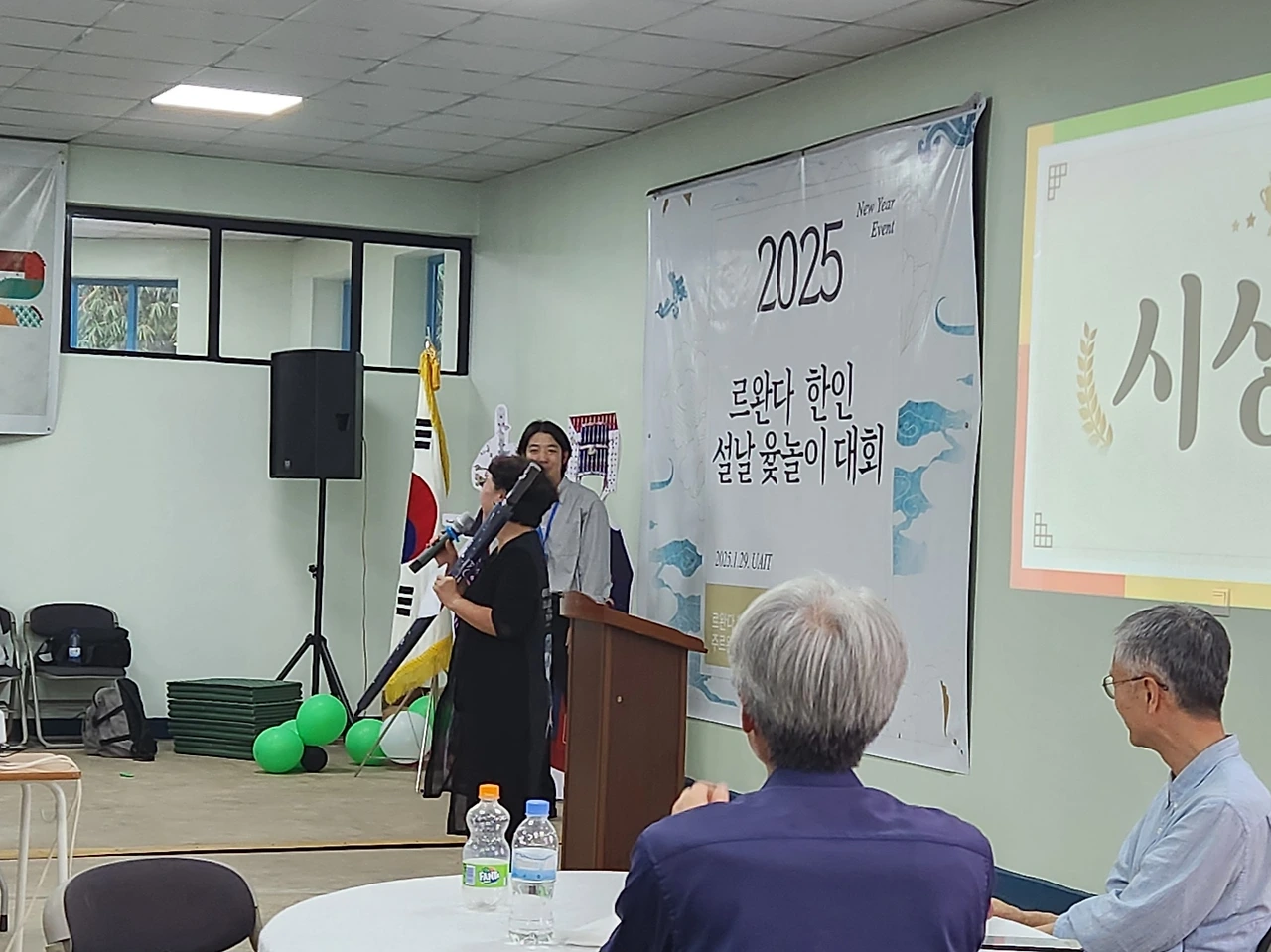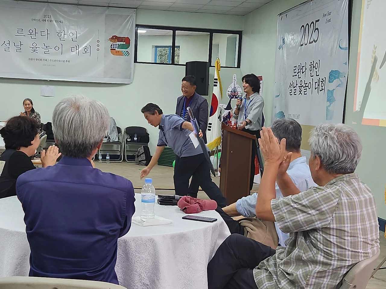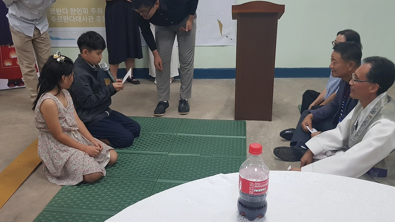 행사의 마무리는 시상이다. 윷놀이 대회를 오면서 사실 우리 팀이 일등을 하는 상상도 해봤다. "심바 상품권 십만 프랑을 받으면 무얼 할까?" 하고 잠시라도 즐거웠다. 시상에 든 팀이 은근히 부럽다. 대중의 환호 속에 시상식에 나와 상을 받아 가는 팀의 주장들은 어깨가 으쓱해 보인다. 비가 자주 오는 르완다에 딱 맞는 우산을 상품권과 함께 덤으로 주다니. 어떻게 이렇게 유용한 생각을 했을까^^ 어느덧 설날 행사장은 오후로 기울어가고 있다. 올해도 정우진 르완다 대사님은 아이들에게 한국의 전통예절을 가르쳤다. 한인회 회장님과 코이카 소장님도 함께 자리했다. 대사님이 맨바닥에 털썩 자리하자 청년들이 얼른 매트를 깔아주는 센스가 돋보였다. 갑자기 불려 나온 아이들은 처음에 부끄러웠는지 잠시 망설이는가 싶더니 이내 무릎을 꿇고 넙죽 절을 한다. 대사님은 격려의 글을 적은 봉투를 아이들에게 건넸다. 그리고 모인 교민 모두가 홀이 꽉 차도록 목소리를 높여 아이들과 함께 설날 동요를 불렀다.