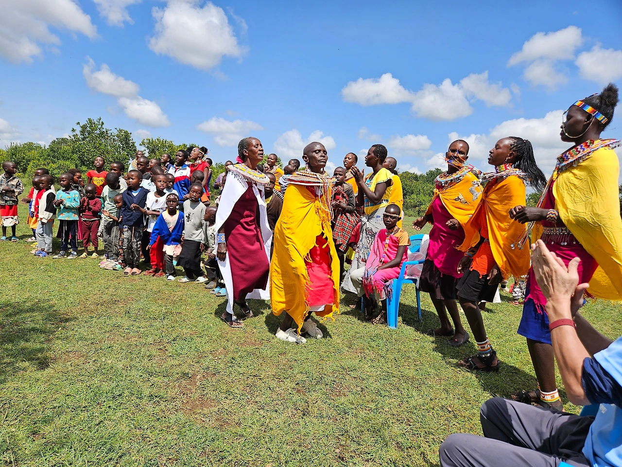 오, 다행이다. 아까 하늘을 덮을 것 같은 먹구름은 아직 이곳에 도착하지 않았다. 예배드릴 동안 하늘은 더없이 맑고 푸르다. 오늘은 특별한 날이라고 여러 차례 특순을 준비했다. 어린아이부터 청. 장년에 이르기까지 노래와 율동이 함께 어우러져 즐겁게 예배를 드린다. 저마다 가장 아름다운 장식으로 치장을 하고 먼 길을 걸어서 걸어서 온 아름다운 발들이다. 여성들의 화려한 의상과 목에 건 비즈공예가 눈에 띈다.
