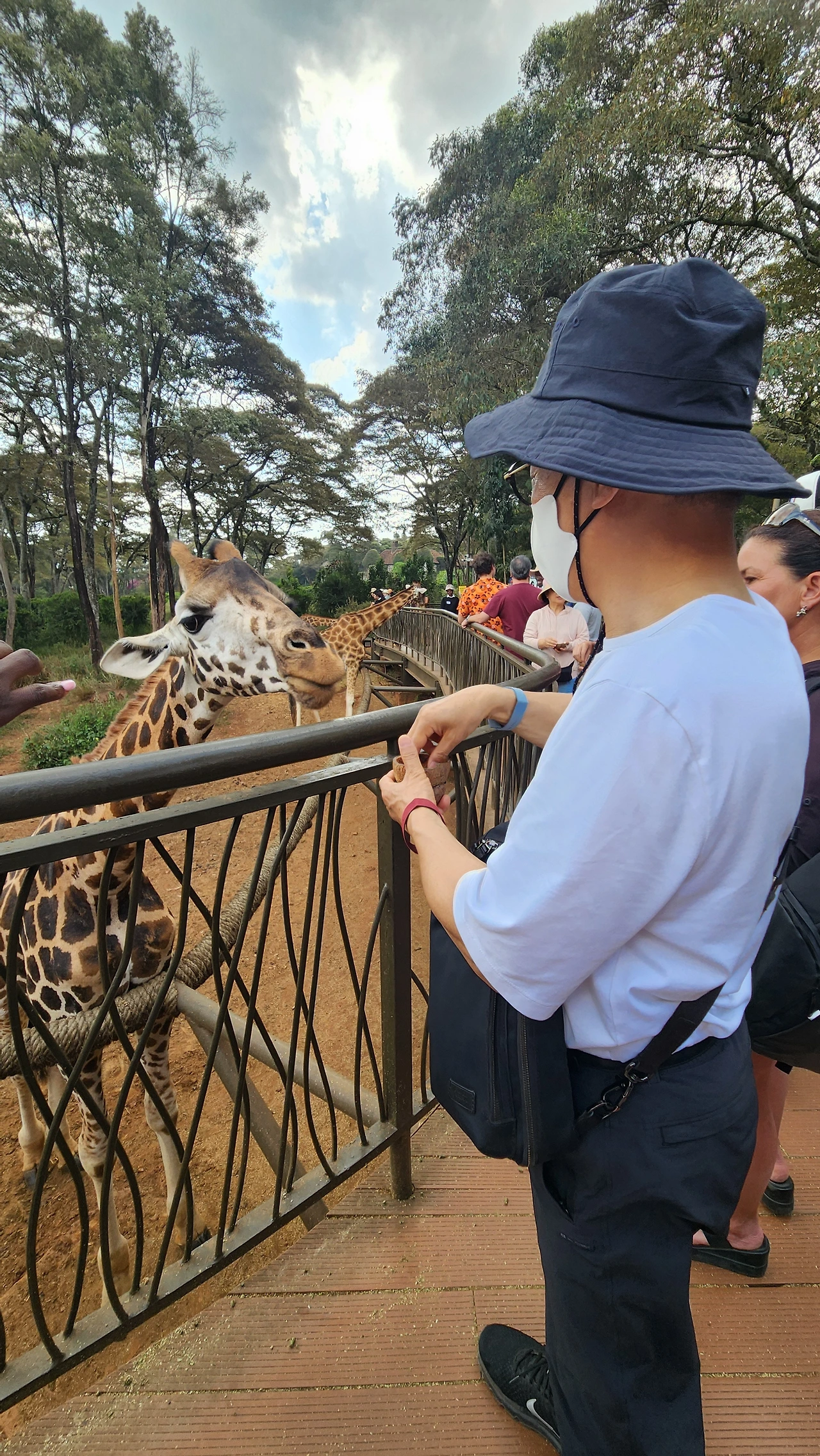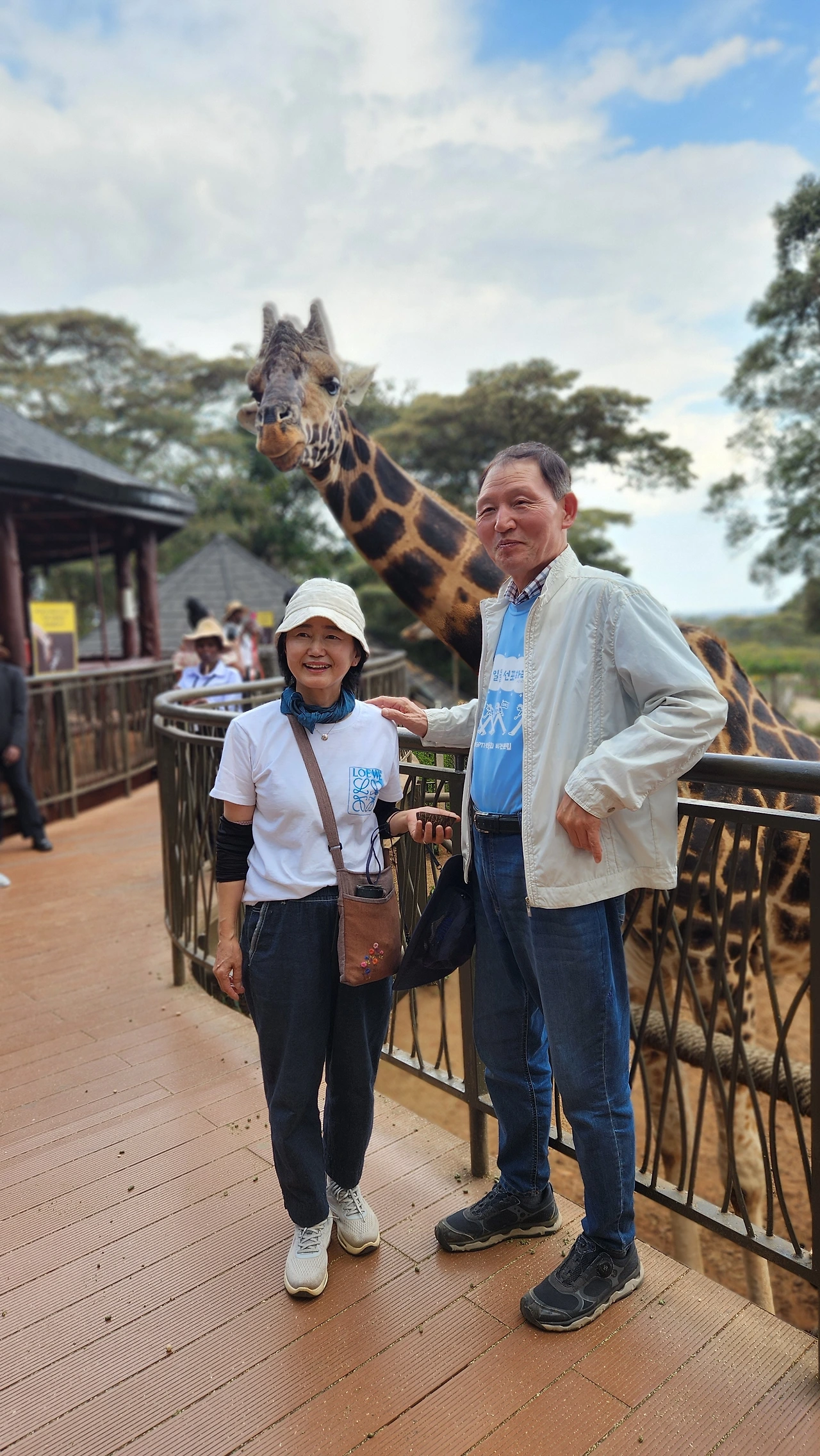 사실, 별생각 없이 왔는데 의외로 많은 투어 차가 서 있고 표를 끊으려고 줄을 서 있는 외국인들의 모습이 많이 보인다. 매표소를 통과해서 데크로 들어갈 때 직원이 나눠주는 기린 먹이를 받아 가면 된다. 펠렛이라고 하는 건초 알갱이다. 둥근형태의 데크 위에는 사람들로 붐비고 있었고, 데크 아래쪽에는 엄청 큰 키의 기린 서너 마리가 먹이를 받아먹기 위해 머리를 좌우로 움직이고 있다.