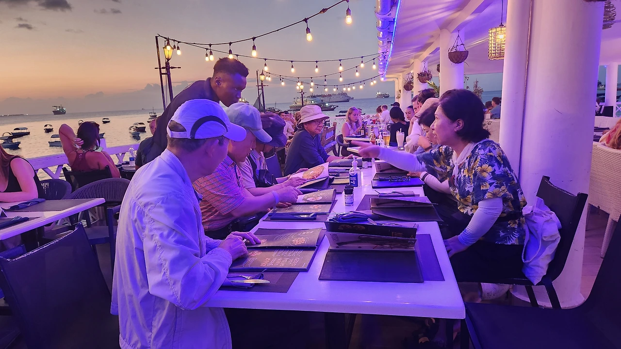 지는 해를 바라보며 사진을 찍고 나서 바닷가가 내려 보이는 레스토랑에서 저녁을 먹었다. 어둠이 짙어가는 거리에서 우리는 가장 안전한 곳이라고 생각해서 이곳으로 들어왔다. 우습지만 우리는 너무 복잡한 곳보다 안전을 택한 것이다. 이곳은 정말 거의 대부분의 손님이 외국인이다. 가수가 라이브로 노래를 부른다. 식사를 하며 바라보는 바닷가에는 정물처럼 작은 배들이 박혀있다. 알전구들이 켜있는 선상같은 레스토랑에서 우리도 아름다운 바다의 풍경이 된다. 어디서 이만한 작품을 건질 수 있으랴~!