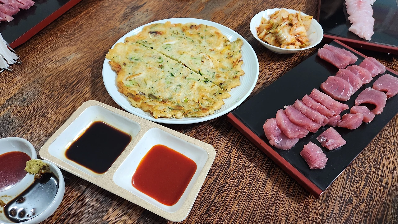 식당 가장 안쪽에 커다란 둥근 테이블이 있다. 우리는 어제 점심 식사를 하면서 오늘 저녁을 예약해 놓았는데, 덕분에 싱싱한 회를 맛볼 수 있었다. 씹을수록 고소하면서도 살이 쫄깃했다. 회와, 부침개, 고구마 순 무침, 김치, 된장찌개 등으로 한국의 맛을 흠뻑 느꼈다.