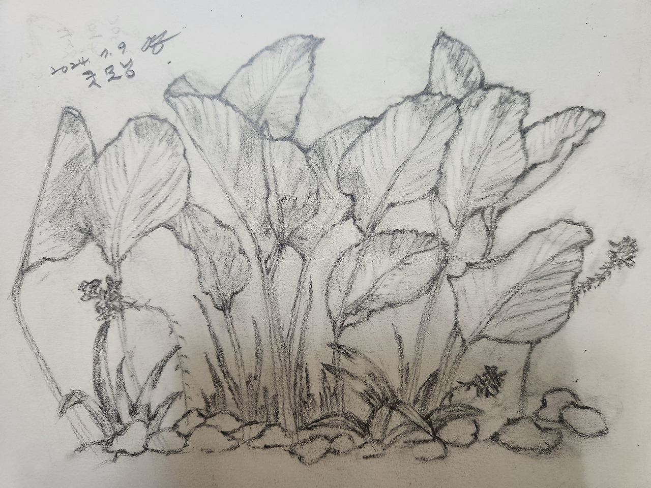 모자를 가져다 썼다. 현관문 열면 코앞이지만 적도 부근인 것 잊지 말기. 그래서 모자는 필수다. 스케치북에 중심선을 긋고 가운데에 이파리 하나를 먼저 그려 넣었다. 그 이파리에게 살짝 귀띔했다. 오늘은 네가 주인공이란다. 그리고 그 옆에 있는 이파리를 또 그려 넣었다. 그렇게 범위를 넓혀 가다 보면 선택받지 못하는 잎들도 있는데 나는 사실, 그것들을 다 그려 넣을 자신도 없고 어떤 것을 선택해서 그려 넣어야 되는지도 잘 모른다. 그냥 마음이 시키는 대로 그릴뿐이다. 커피를 마시고 다시 집중한다.
