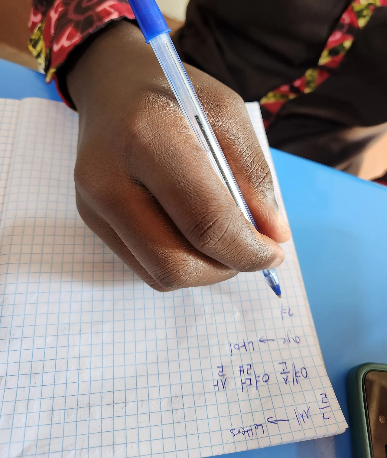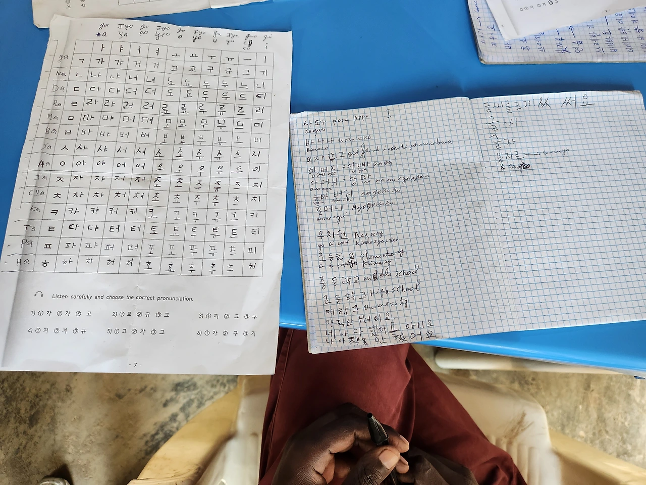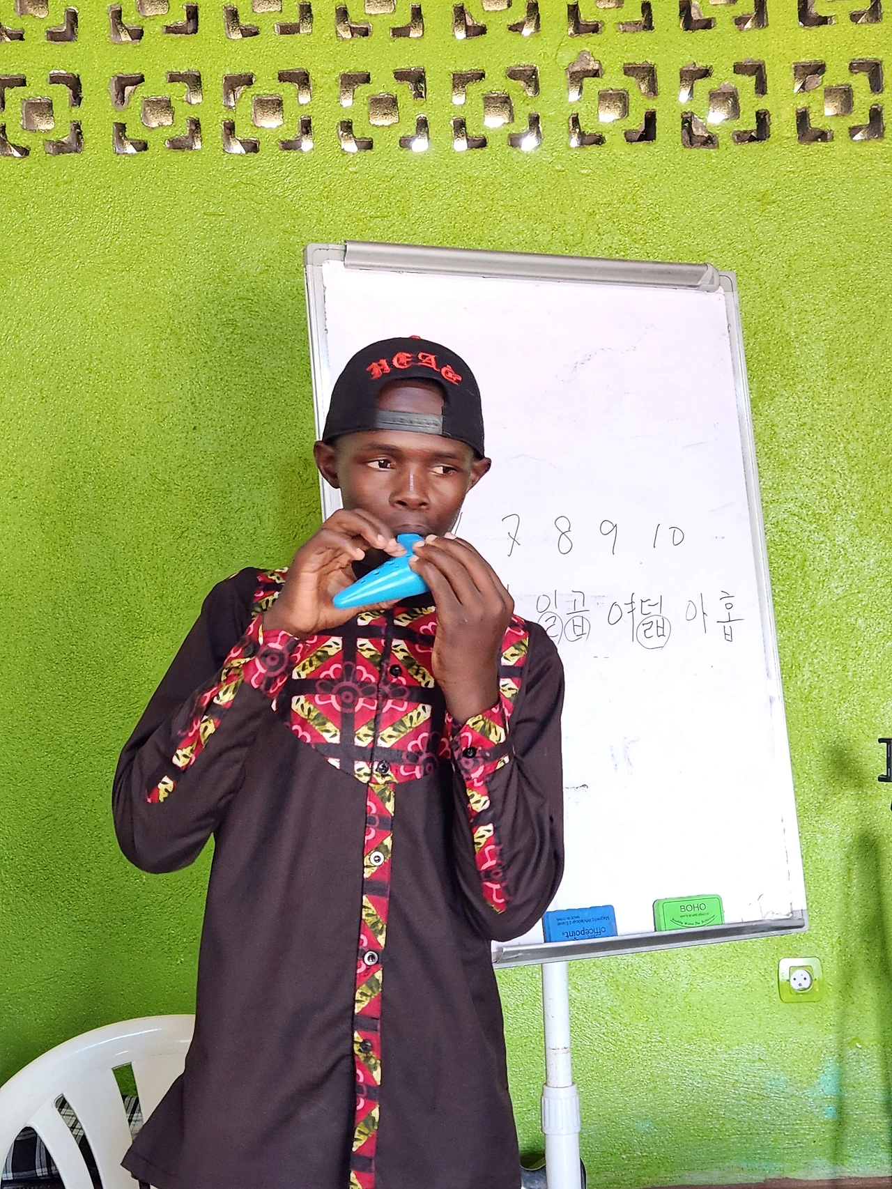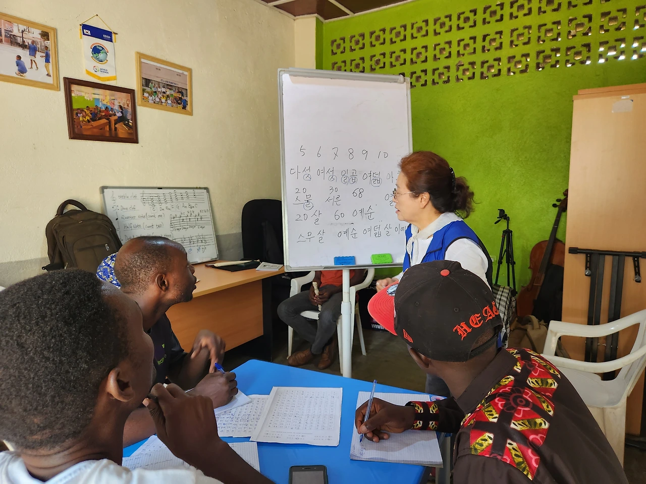 그녀는 현재 이곳에서 한국어와 음악수업을 진행하고 있다. 내가 도착할 즈음에는 한글 수업이 한창 진행되고 있었다. 머리를 뒤로 질끈 묶고 그녀의 트렌드 마크처럼 파란 조끼를 입은 이명희 단원은 전직 교사답게 학생들을 집중시키며 수업을 하고 있었다. 걸걸한 목소리가 밖에까지 들렸다. 한 사람 한 사람과 눈 맞춤을 하며 질문도 하고 답도 들으며 또 이들이 얼마나 이해하고 있는지 호응하며 즐겁게 이어 나갔다. 처음에는 음악 수업만 하다가 올 10월부터 한글을 가르쳤다고 한다. 비록 학생 수가 세명이었지만 이들의 눈빛은 배움에 대한 열기로 뜨거웠다. 오늘은 나이를 말하고 적는 방법, 그리고 내 이름을 말하고 옆 사람의 이름을 말하는 법. 인사하는 법 등을 가르쳤다. 한글 수업을 시작한 지 3주 정도 되었는데도 학생들 수준이 내가 생각했던 것보다 훨씬 높았다. 질문하고 답하는 과정에서 격려와 칭찬의 모습을 아끼지 않는다. 베테랑 선생님의 모습이 이런 것이 아닐까. 대답을 잘 못하는 피터까지 챙긴다.