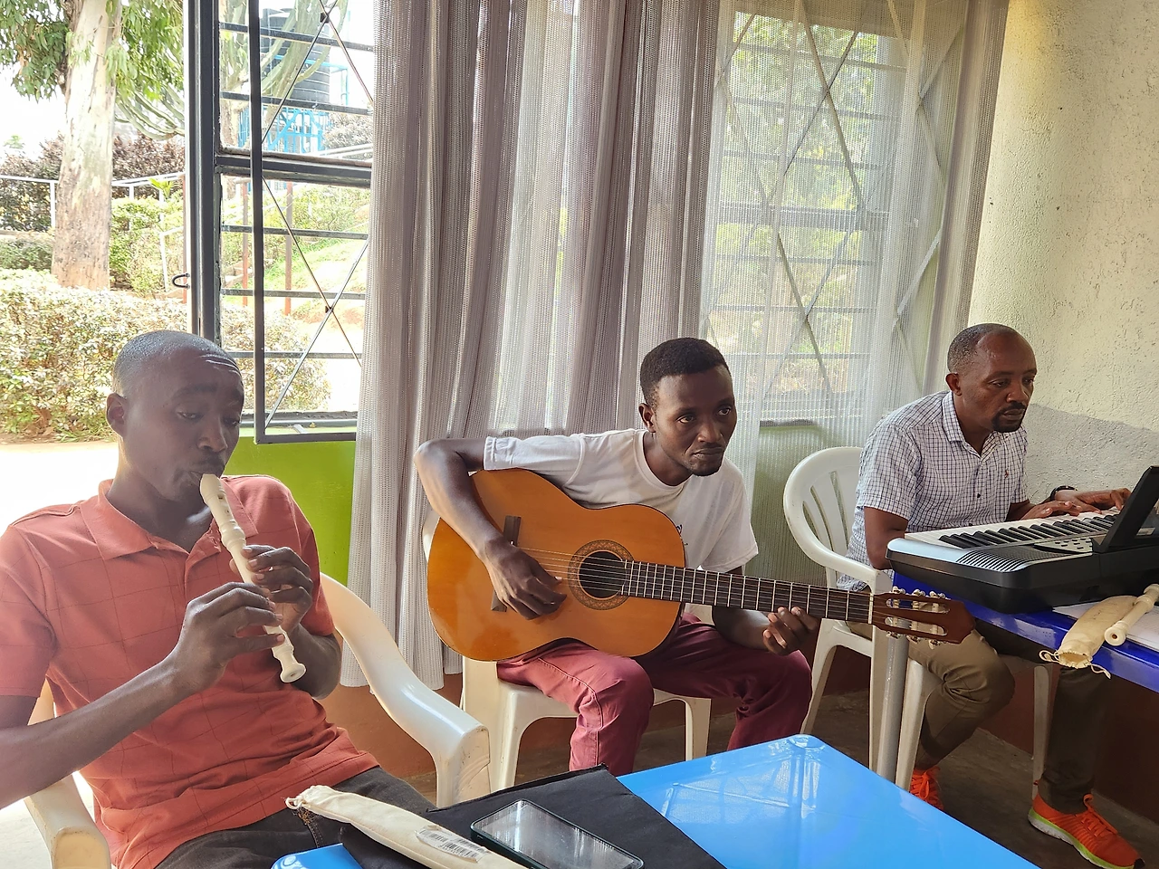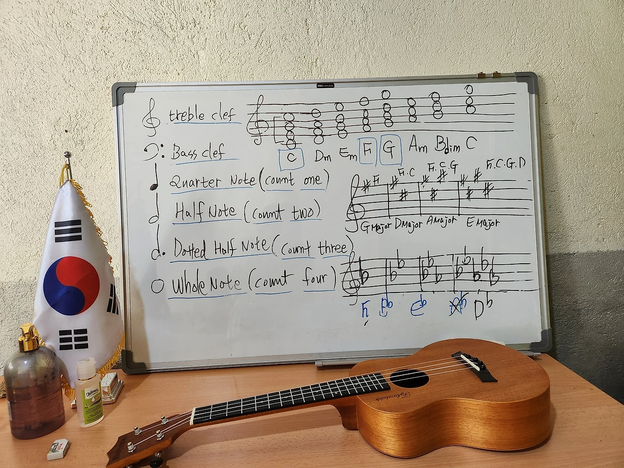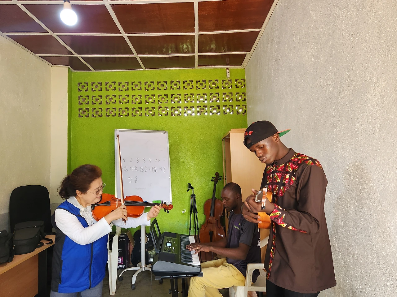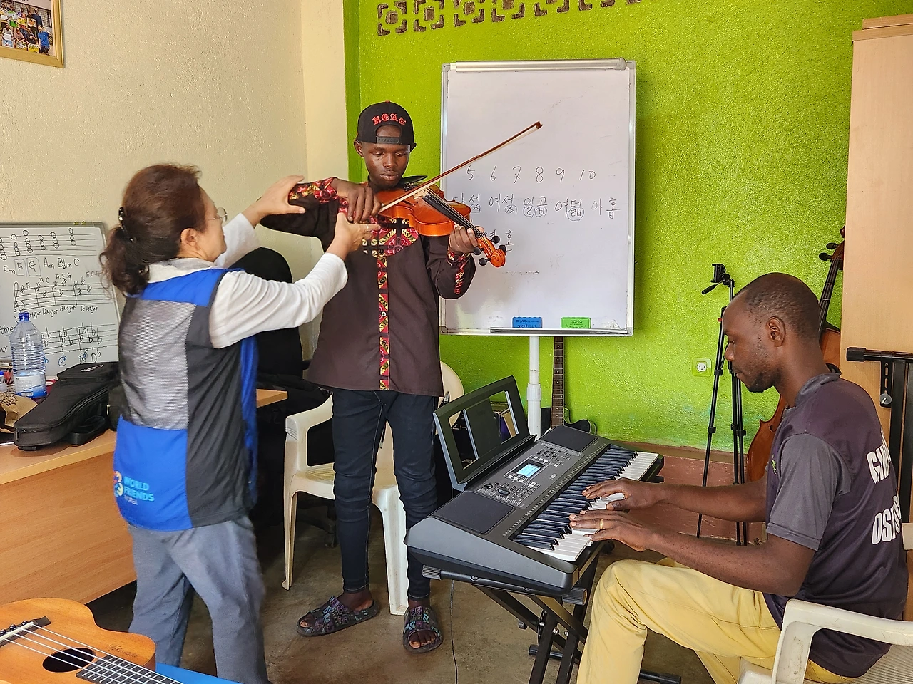 간식을 마친 후 음악 수업이 진행되었다. 음악 수업에는 한글 수업을 받은 학생들을 포함해서 다섯 명의 학생들이 모였다. 아마니는 우쿨렐레, 피터는 키보드, 존은 리코더, 파비앙은 피아노, 빈센트는 기타를 연주한다. 역시 음악은 이들의 몸에 딱 맞는 옷을 입은 것처럼 자연스러워 보였다. 악기 하나하나 지도해 주는 이명희 단원 모습과 함께 연주하는 학생들의 모습을 동영상으로 가득 담았다. 행복한 모습이 이 속에 있다. 자신이 가지고 있는 재능을 학생들에게 전수하는 모습이 사뭇 진지하기까지 했다. 그리고 함께 따라가는 학생들의 모습 또한 그랬다. 순간 교실은 아름다운 하모니로 채워졌다.