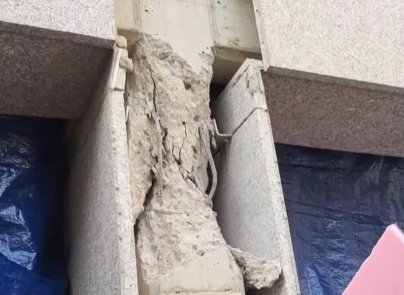 손상된 기둥을 보면, 콘크리트가 파열되고 철근까지 바깥쪽으로 휘어졌음을 알 수 있다. 그런데 기둥의 파열을 막아주는 띠철근도 눈에 띄지 않는다. 부실 공사의 냄새가 난다.
