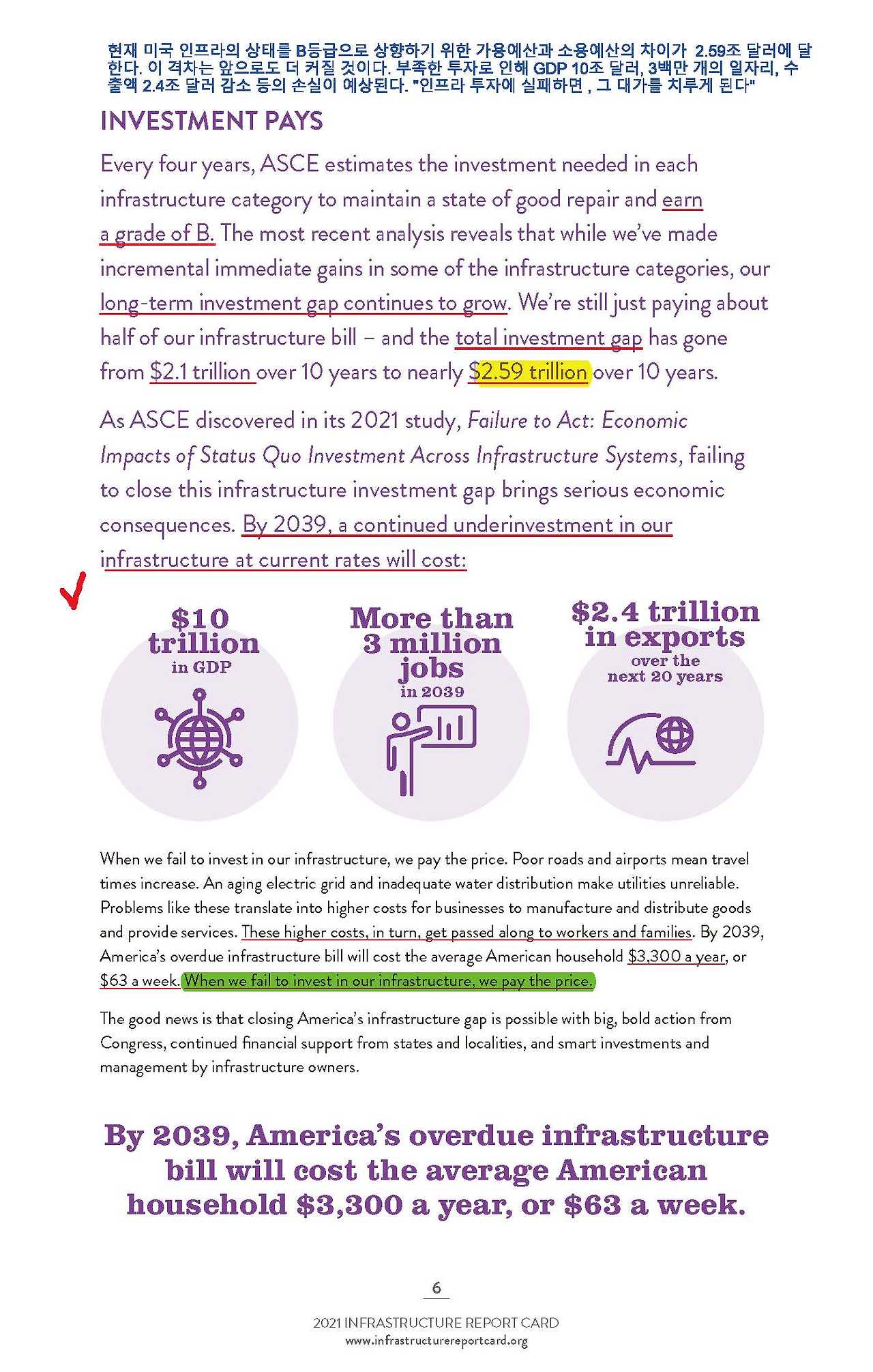 4년마다 발간되는 미국 토목공학회(ASCE)의 '인프라 평가보고서(report cart)' 중 2021년 보고서에서 발췌한 내용입니다. 2021년 기준으로 기반시반시설 수준이 C+등급이고, 이를 B등급으로 상향하는데 드는 비용이 총 5.93조달러인데, 모자라는 돈이 2.59조달러라는 겁니다.