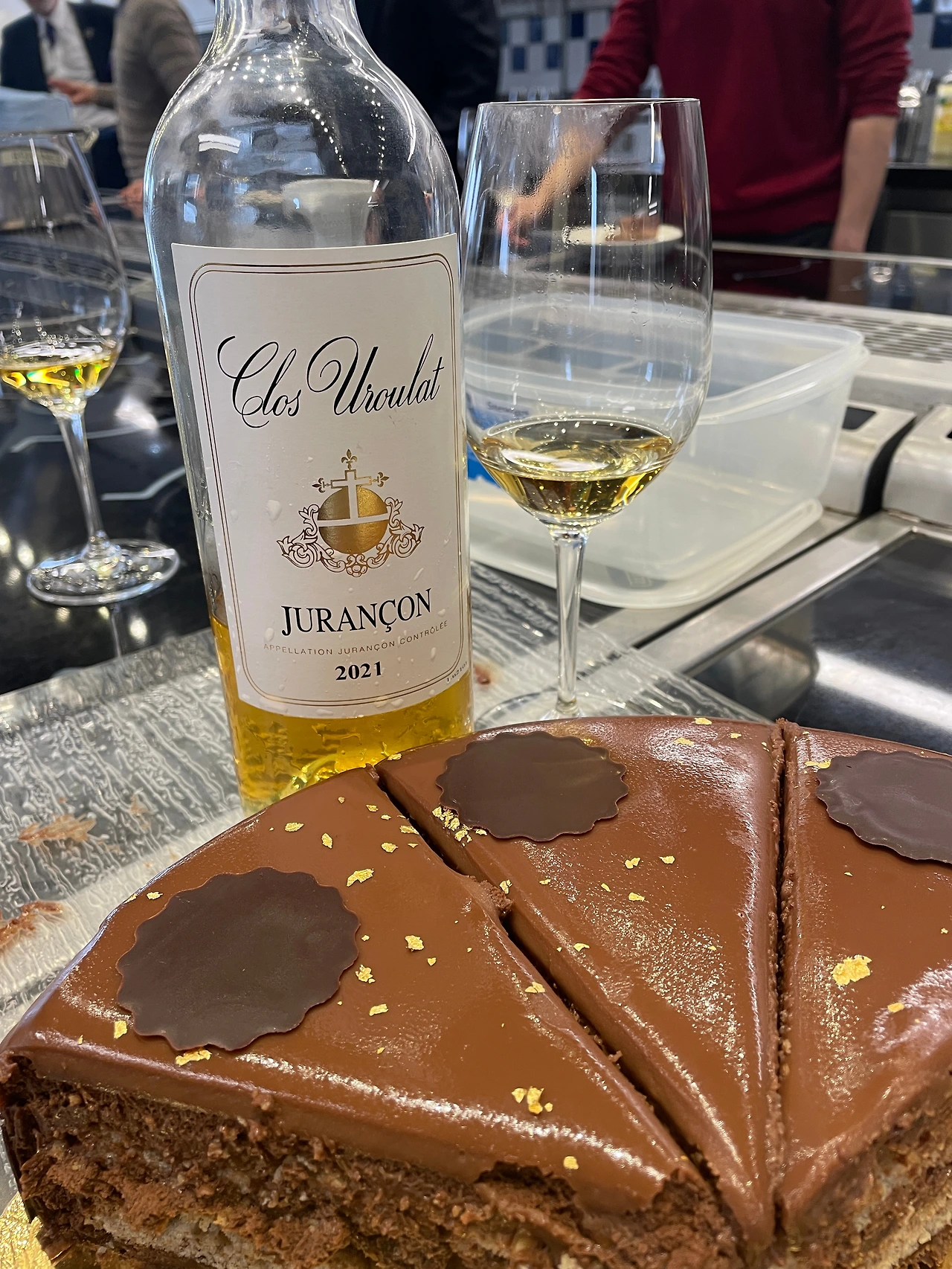 지난 금요일 점심에 학교 주방에서 마지막 페어링 실습수업이 있었다. 셰프가 디저트로 다크 초콜릿 케이크를 준비했고 와인은 내가 미리 주랑송을 선택했다. 며칠 전 수업에서 시음한 와인인데 연기, 가죽 향과 함께 단맛, 입안을 감싸는 미끌거림이 살짝 있어 다크 초콜릿과 잘 어울릴 듯했다. 프랑스 소믈리에 대회 우승자이자 현재 에어 프랑스 수석 소믈리에인 자비에가 생각지 못한 기막힌 조합이라고 극찬을 한다. 다크 초콜릿과 와인 페어링은 정말 어렵다고 하며.