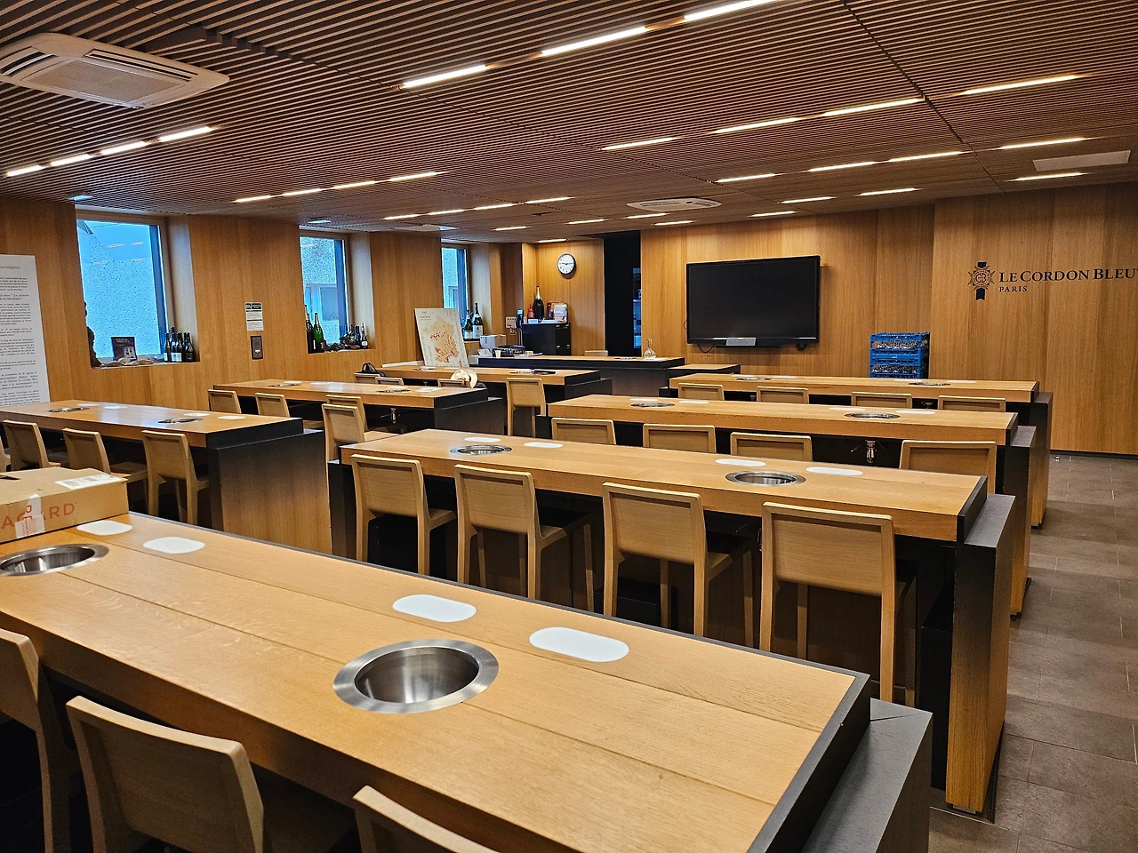 안내 직원을 따라 우리 교실, 바쿠스 룸으로 이동한다. 모든 테이블에 spittoon이라고, 조그만 스테인리스 싱크대가 있다. 거기에 와인을 뱉고 밑의 레버를 당기면 물이 나와 씻겨 내려가는 원리다. 잠시 후 르꼬르동 블루의 요리와 제과 선생님들이 오셔서 인사를 하고 학교 전반에 대해 안내해 준다. 올해는 르꼬르동 블루 개교 130주년이라 10월에 큰 행사가 있을 거라고 한다.