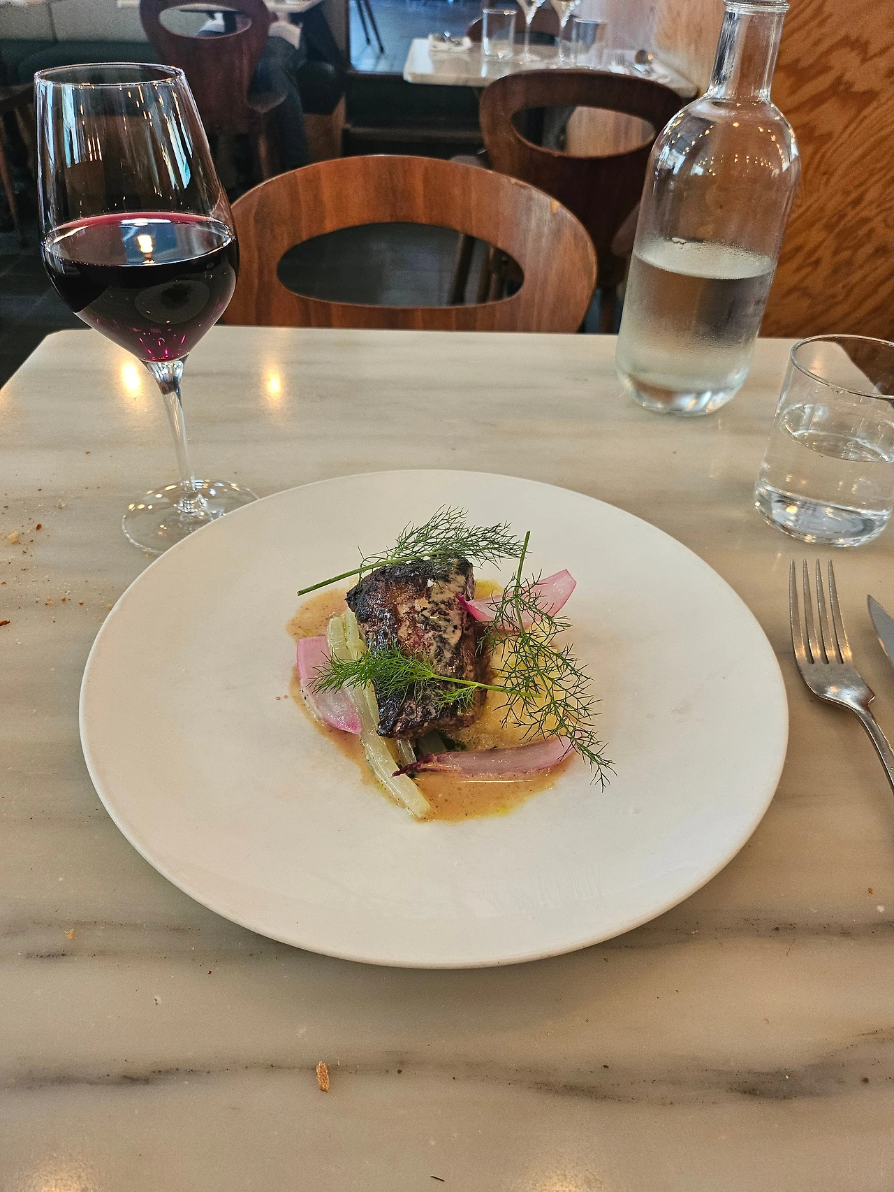 전채는 생선을 시켰는데 pollock이라고 찾아보니 명태다. 숙성회와 찜의 중간 정도 식감인데 낫또 느낌의 콩샐러드, 야채와 허브를 곁들였다. 일본 퓨전 스타일이라고 할까?