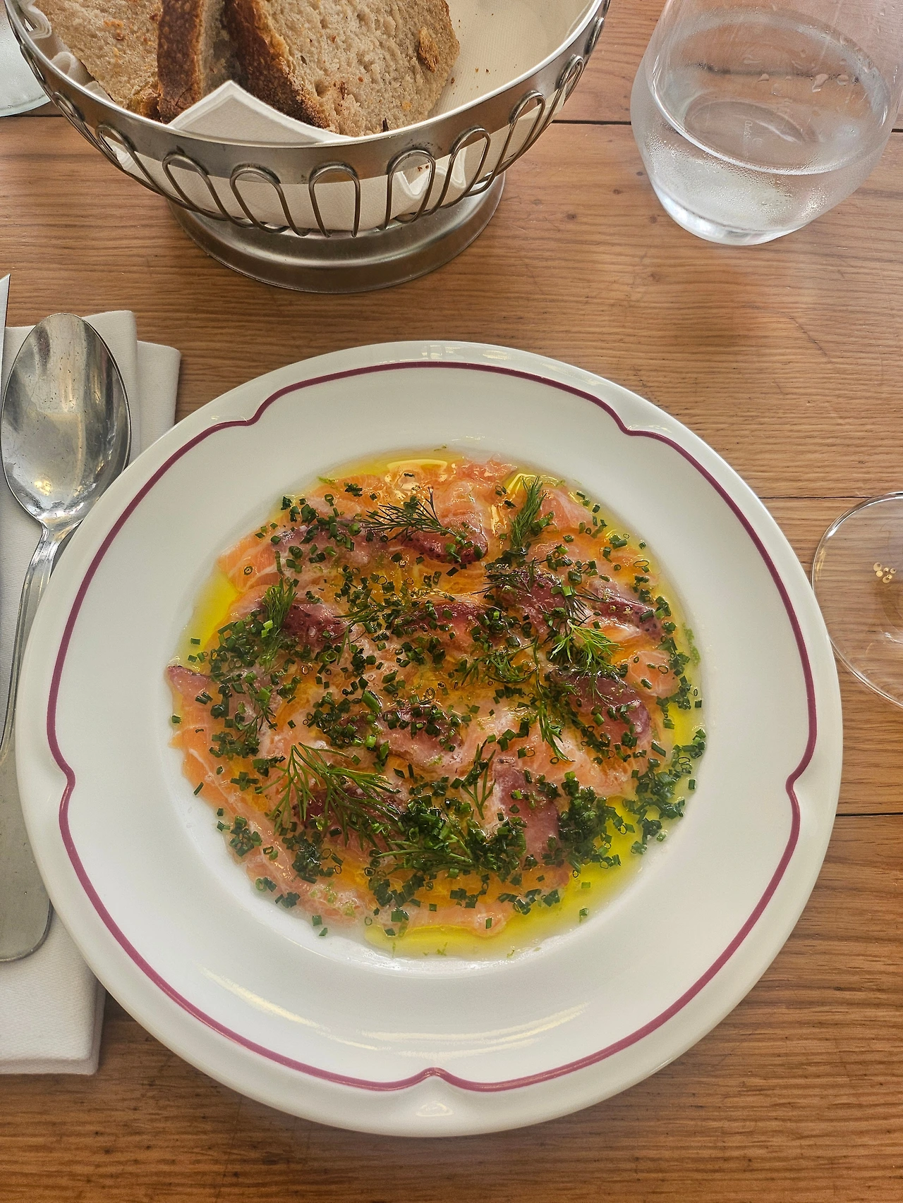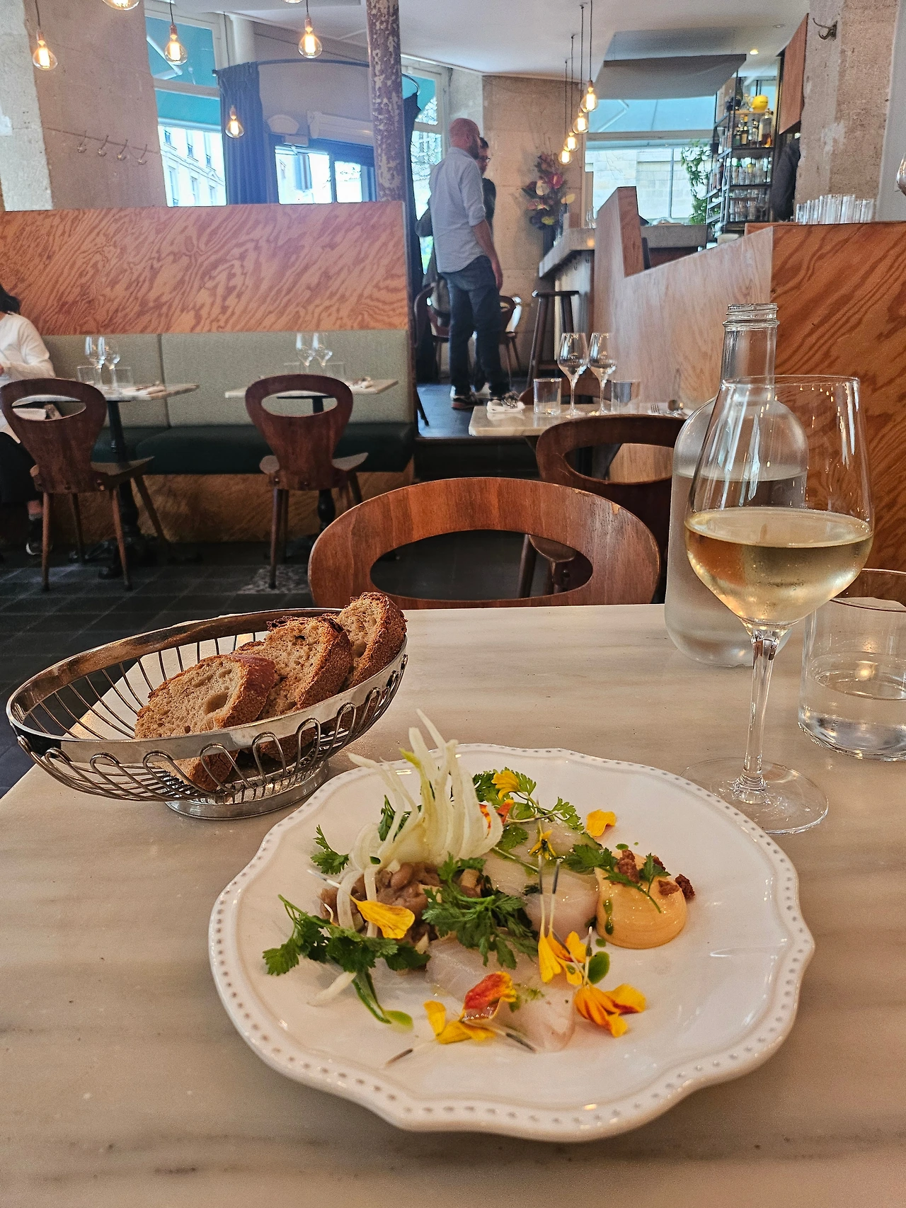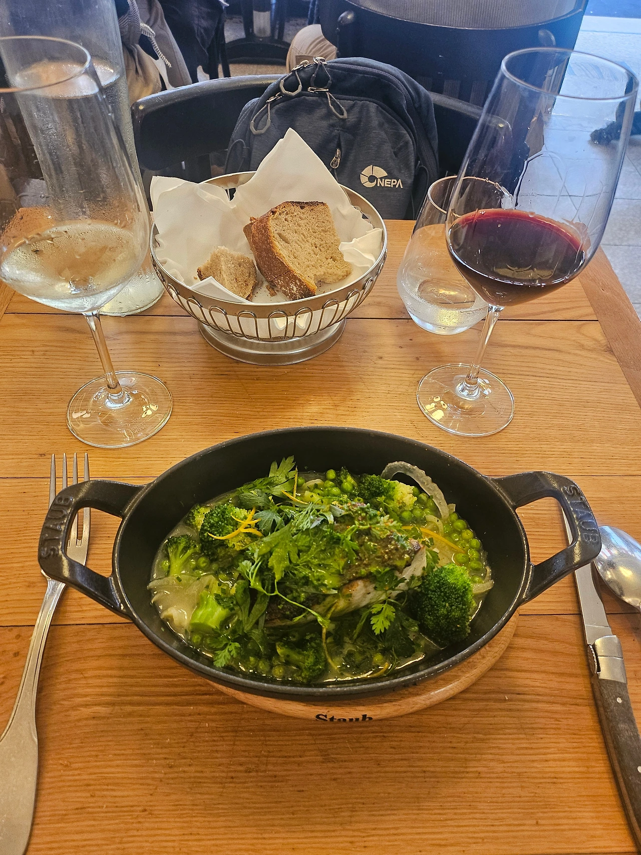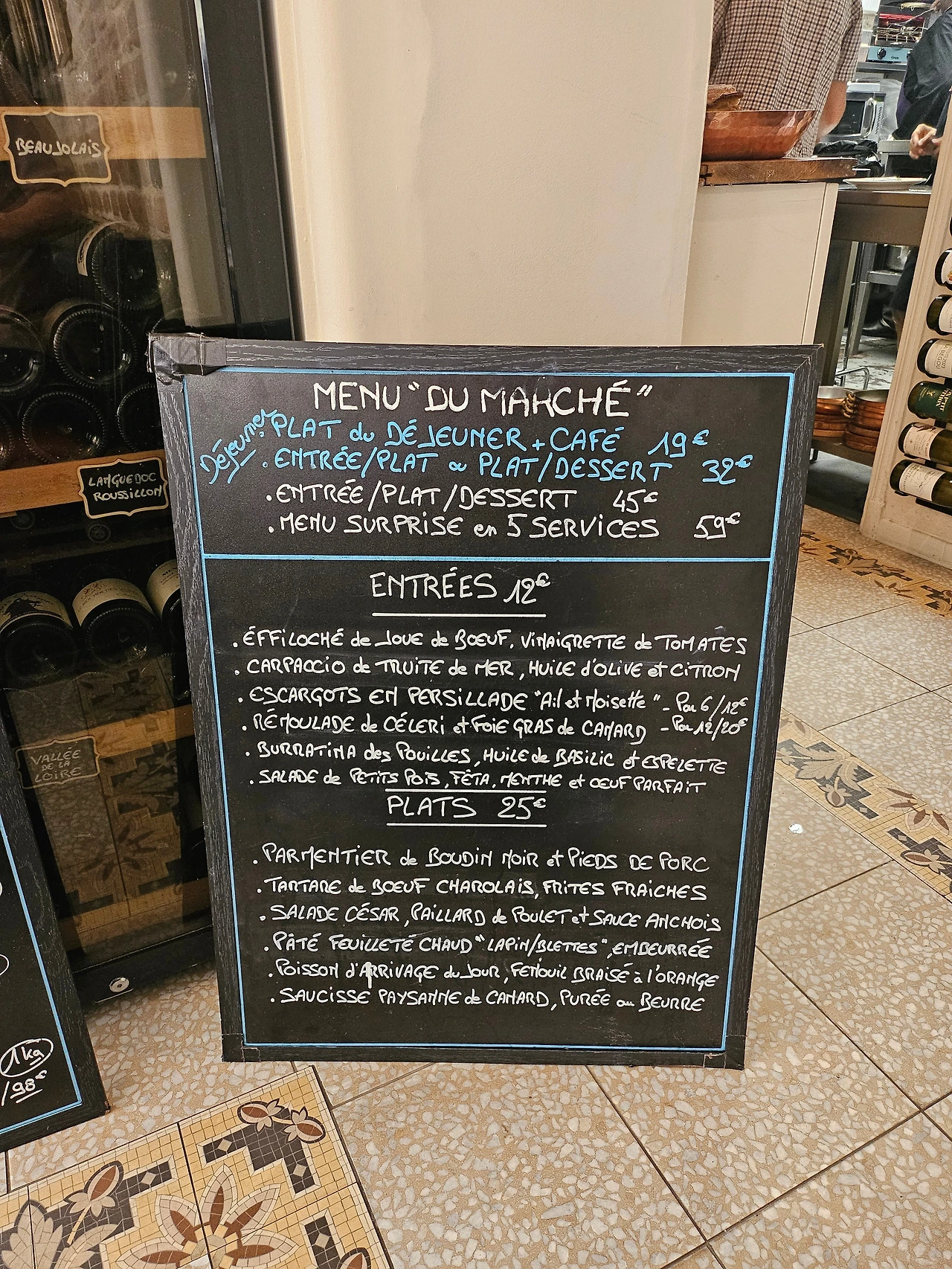 잔 와인을 주문하면 매그넘이라고 1.5L짜리 큰 병을 가져와 따라주는 것도 우리나라에서는 경험한 적이 없어 좋았다. 종이 메뉴판이 없고 분필로 쓴 칠판을 손님이 보기 쉬운 곳으로 옮겨다 주는 것도 독특한 아이디어인데 관광객 입장에선 오히려 손가락으로 가리키며 주문하면 더 쉬울 것 같다.