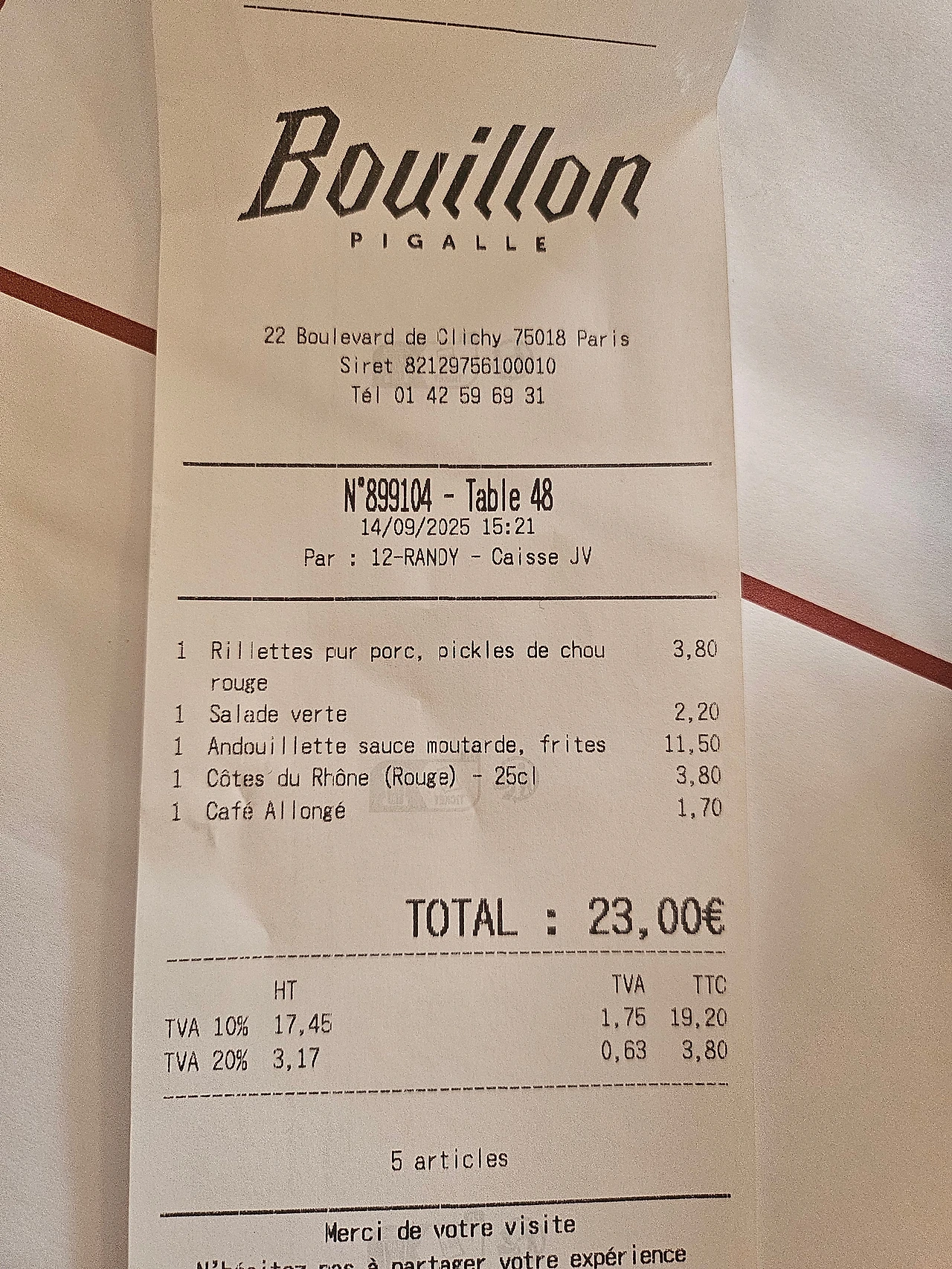 샐러드도 시키고 레드 와인 250cc에 커피까지 마셨는데, 모두 23유로. 대기줄이 길 수밖에 없다. 몽마르트 언덕 바로 밑에 있어 일정에 맞추어 미리 예약한다면 훌륭한 프랑스 전통 음식 체험이 될 것같다.