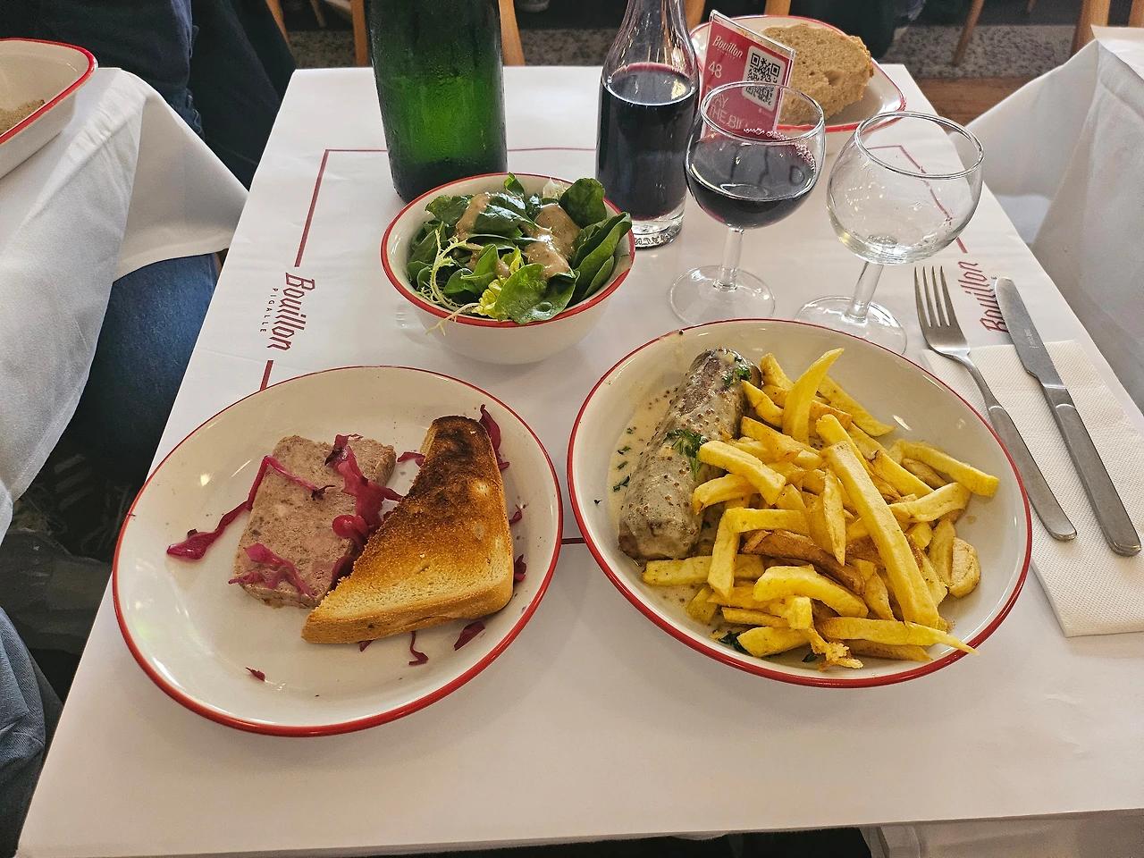 음식이 아주 다양한데 난 먹어본 적 없는 메뉴를 주문. 전채로 리예트 rillette. 삶은 돼지고기를 잘게 찢은 후 지방과 후추 등을 섞어 만든 음식으로 주로 빵에 발라 먹는다. 메인은 앙두예트 andouillette. 우리 순대랑 비슷한데 안에 당면이 아니라 잘게 썰어진 내장이 들어있다. 후추와 허브가 들어가 느끼하진 않았다.