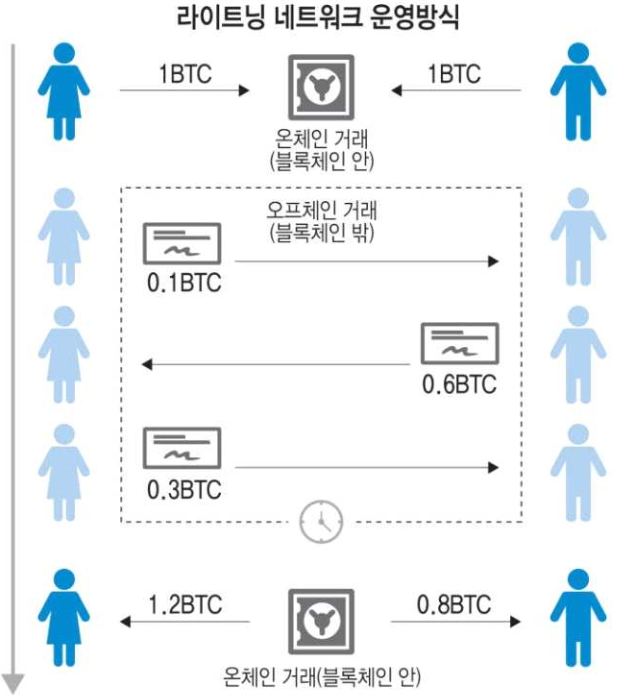 라이트닝 네트워크는 모든 거래 내역이 블록 안에 기록될 필요가 없다는 아이디어에서 시작되었다. 중요한 거래 내역만 블록에 저장하고 그 외의 것들은 블록체인 밖에서 처리하는 방식으로 거래 자체의 무게를 줄이는 것이다.