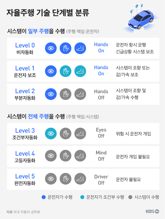 자율주행 기술의 레벨은 2016년 미국 자동차공학회가 제시한 개념으로 구분되며, 0부터 5까지 총 6단계로 나뉜다. 레벨 0부터 레벨 2까지는 주행 책임이 운전자에게 있으며, 자율주행 시스템은 속도 조절, 차선 이탈 방지 등 보조적인 역할만을 맡는다. 레벨 3부터는 주행의 주체가 시스템이 되며, 위급 상황에만 운전자의 관여가 필요하다. 더 나아가 고등자동화인 레벨 4와 완전자동화인 레벨 5는 인간 운전자가 운전석에 없어도 괜찮은 단계이다.