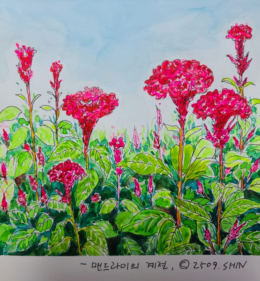 나는 어릴 적 짙은 붉음과 낯선 모양의 맨드라미꽃이 이유도 없이 무서웠다. 채송화나 봉숭아처럼 귀엽거나 예쁘지도 않은 것이 꽤나 쌈닭처럼 호전적이고 싸납게 느껴져서였다.