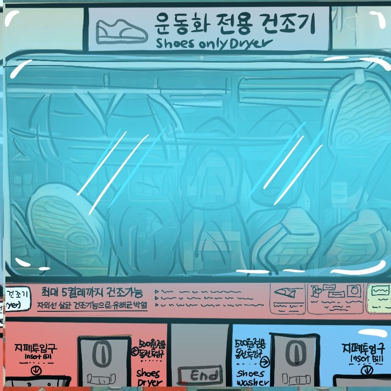 '이건 뭐지?' 하는 불안한 생각을 하면서, 동전을 몇 개쯤 넣었을까.... 운동화 전용 세탁기 위에 있는, 운동화 전용 건조기에 전원이 켜지면서 "윙~"하는 소리를 낸다.