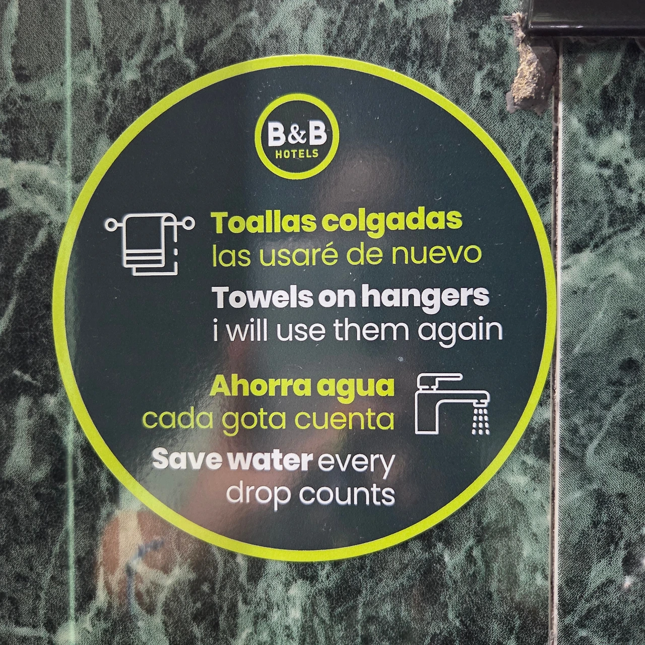 '포인트 인테리어인가....' 생각하며, 벽 쪽을 보니 물 한 방울 한 방울이 소중하다는 '물절약 캠페인 문구'가 딱 붙어 있다. 스페인은 비가 적게 오고, 건조한 기후다 보니, 물부족 국가인 것이다. 흠... 물 쓰듯 쓰면 안 될 듯하다.