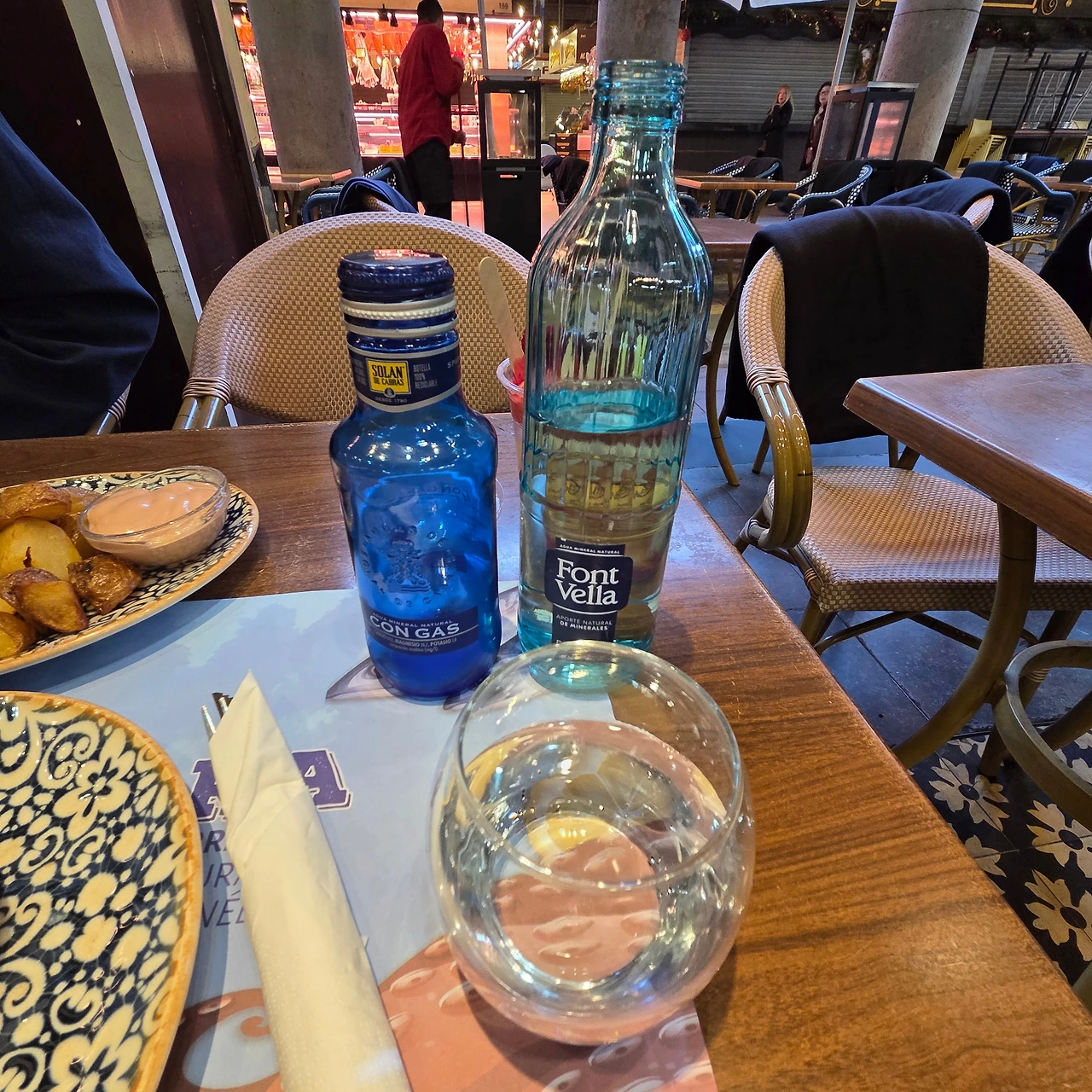 스페인은 식당이든 어디서든 물은 다 사 먹어야 한다. 정수기가 없다. 보통 물(아구아) 한 병이 2~3유로 정도 한다. 물이 곧 돈이다. 멋진 푸른 병이 물병이라니...