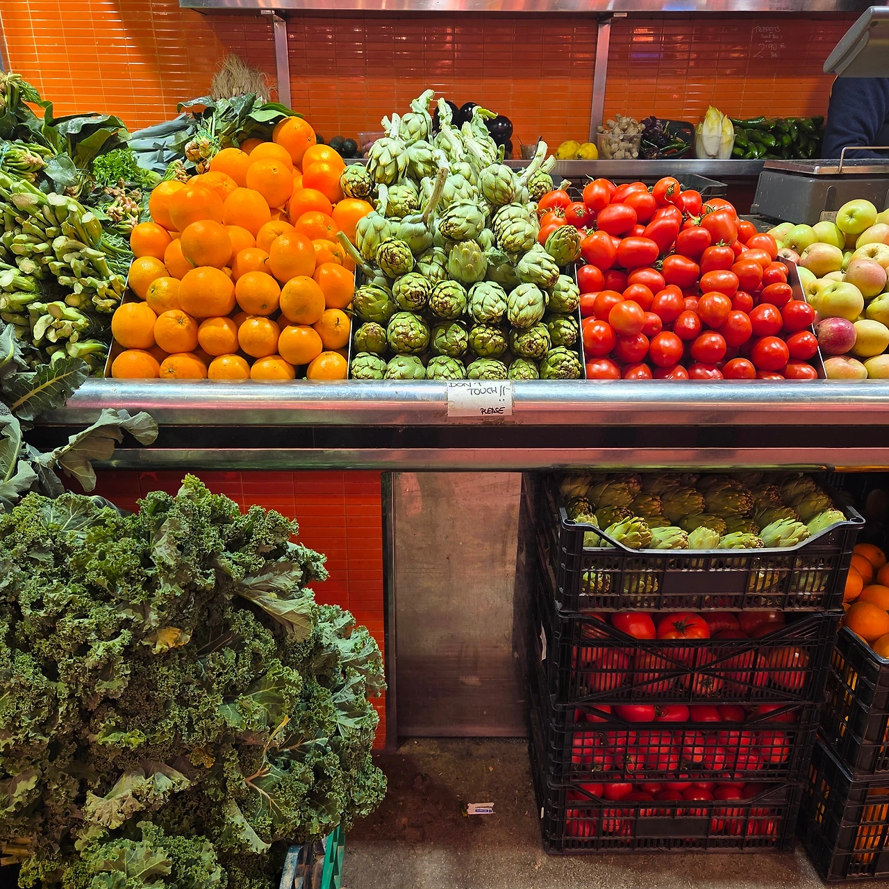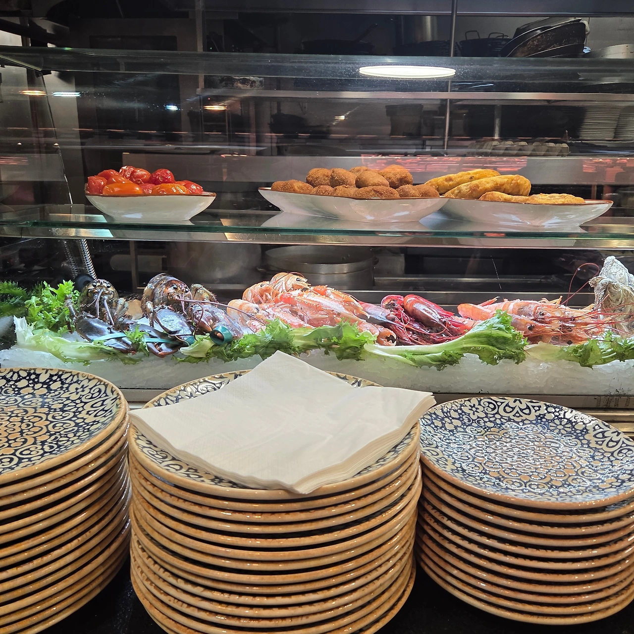 30여 분을 기다려 안내된 곳은 오픈 키친의 카운터 좌석이었다. 매장 테이블은 이미 만석이다. 3명이 나란히 앉는 것도 괜찮겠다 싶었다. 카운터 쪽에는 갖가지 신선한 야채와 해산물, 버섯, 고기류들이 진열되어 있어 보는 이로 하여금 군침돌게 한다.