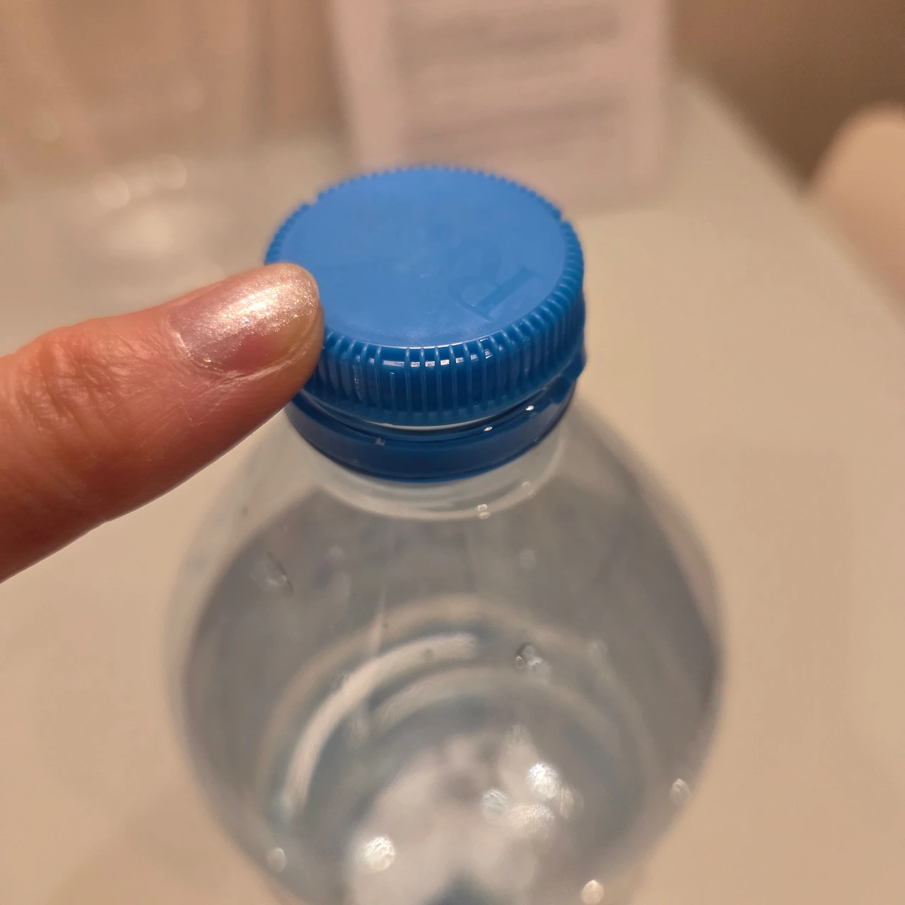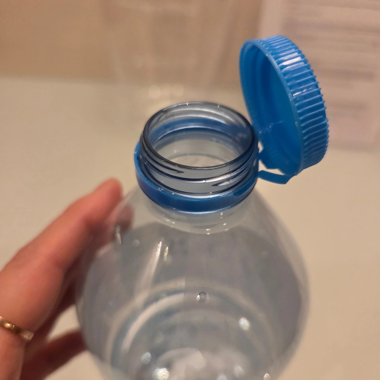 저녁에 주방에서 물을 먹으려고 뚜껑을 열었는데, 또 분리가 안된다. 자세히 보니, 우리나라 생수병과는 다르게 뚜껑높이가 절반정도인 것이, 돌려서 따고 나면 뚜껑이 분리되지 않고, 끝에 연결되어 매달려 있다.