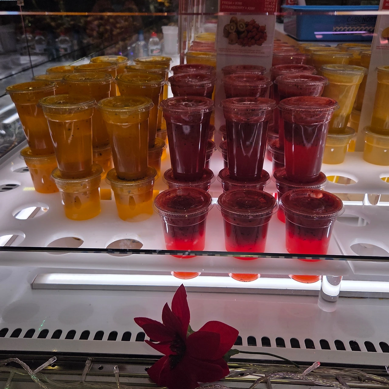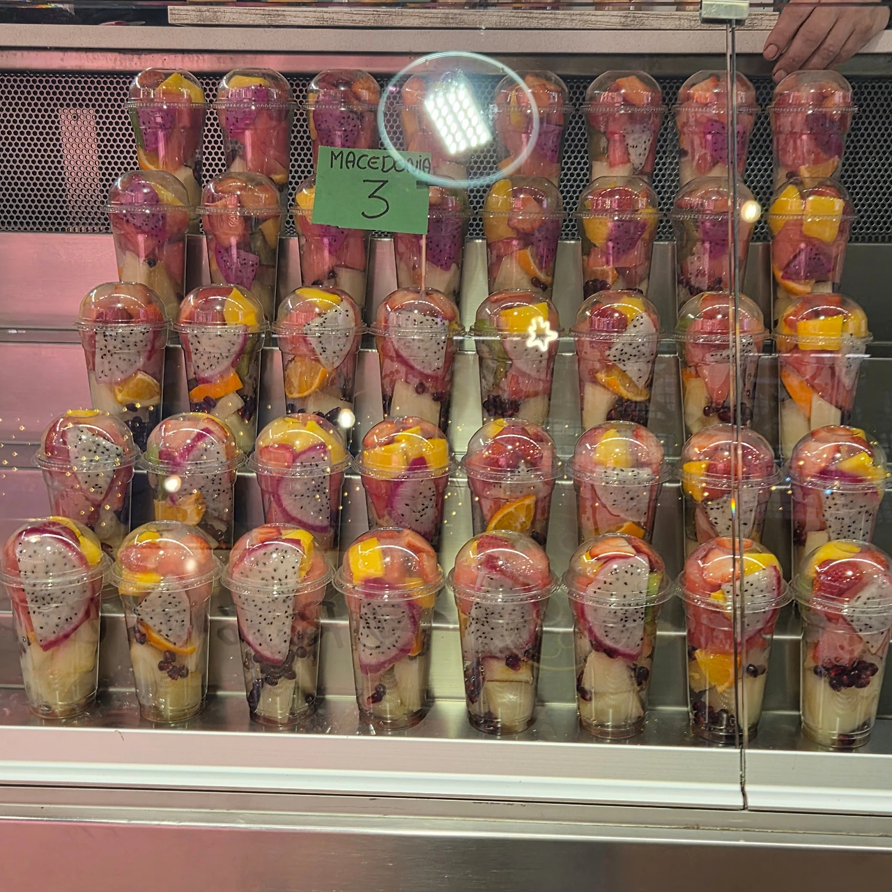 스페인의 뜨거운 태양아래 알록달록 잘 익은 과일들, 조각 과일 마세도니아도 먹기 편하게 담겨 있다.