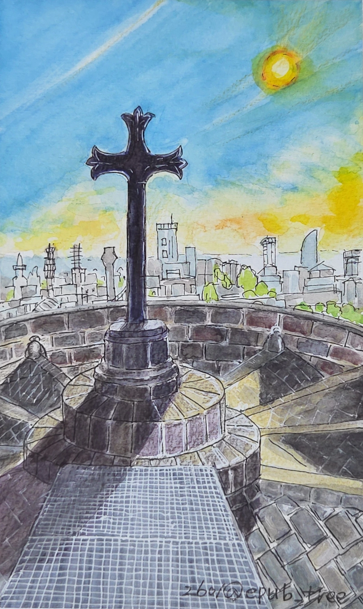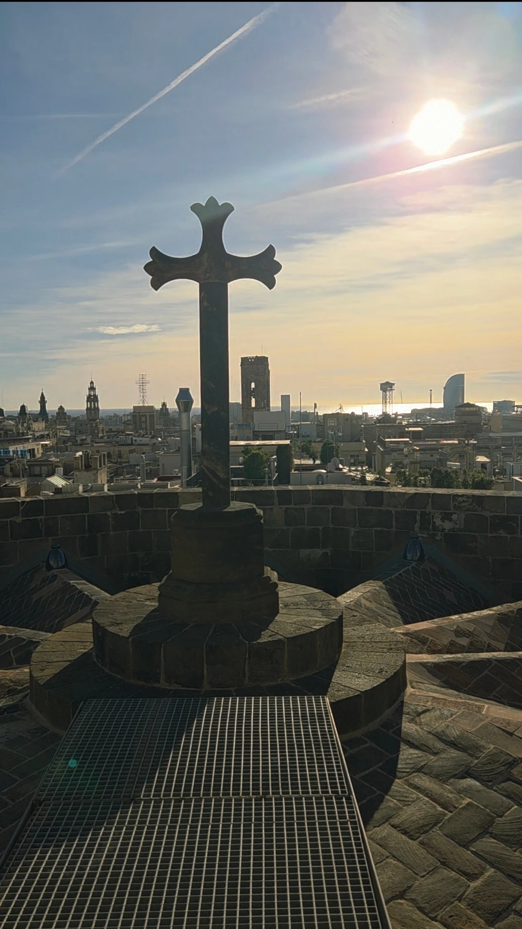 여기 회랑 끝 십자가가 있는 곳이 포토존이다. 성 십자가로 덮여 있는 돔과 회랑, 여기서 바르셀로나를 한눈에 파노라마처럼 360도 돌아보며 전망할 수 있다. 저 멀리 바다와 수평선도 보인다.