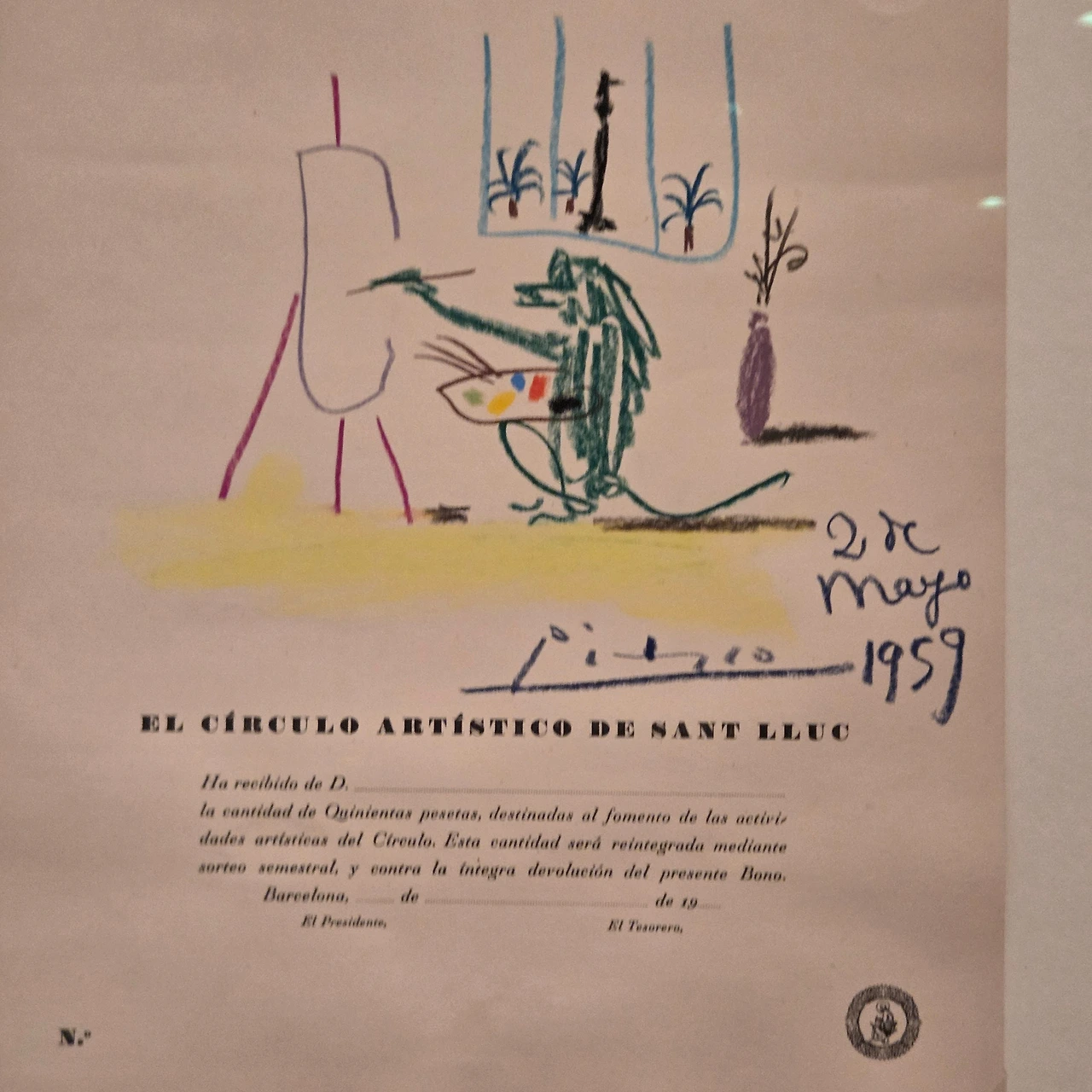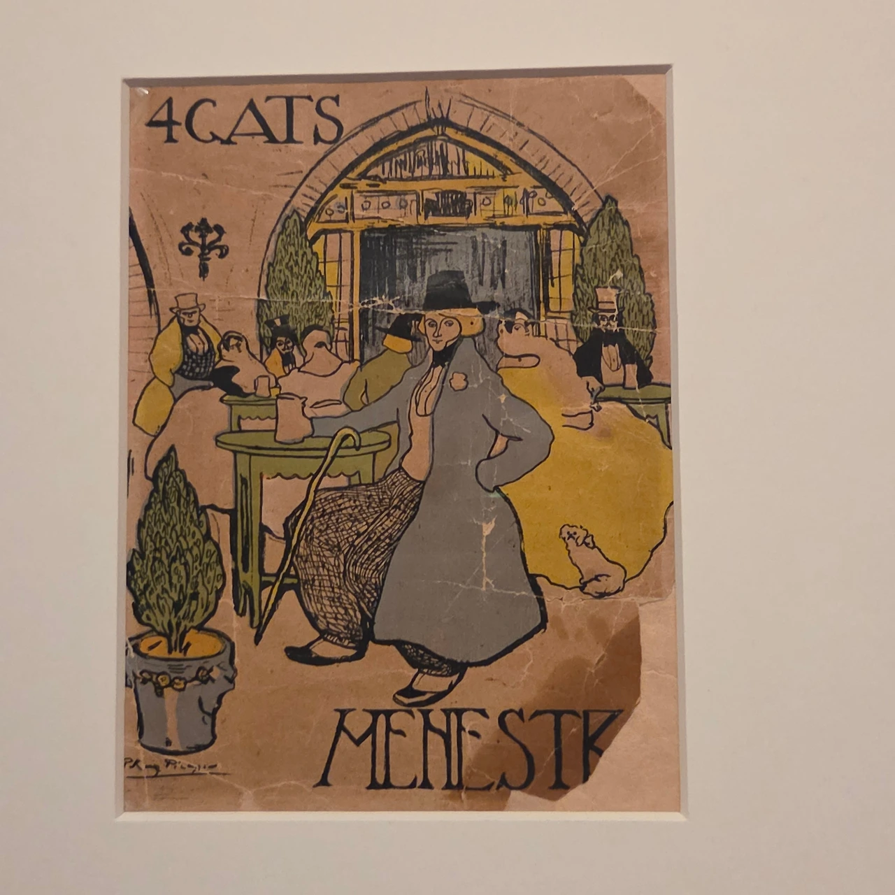 지나다 발길을 멈춘 곳. 바르셀로나 예술계에서 활동하며 자신만의 스타일을 탐색하던 시기의 석판 인쇄물 앞이다. 메뉴판을 홍보하는 실용적 목적을 위한 작업이면서도 예술적 감각이 강하게 드러난 작품이다. 요즘시대로 말한다면 홍보용 일러스트 같다.