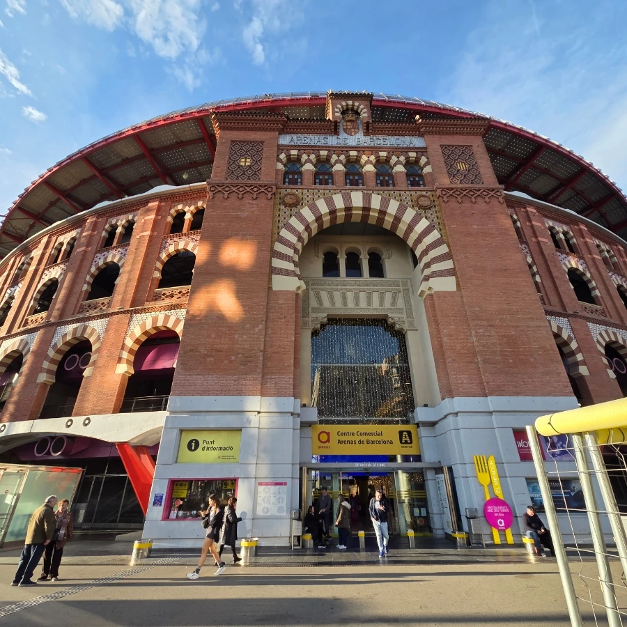 에스파냐 광장 앞 아레나스 드 바르셀로나(Arenas de Barcelona) 쇼핑몰이다. 1900년대에 지어진 투우장 건물을 개조하여 만든 쇼핑몰로, 외관의 붉은 벽돌과 원형 구조가 매우 인상적인 건물이었다. 옥상 데크에 오르면 에스파냐 광장에서 몬주익 언덕까지 시내 전경을 한눈에 전망할 수 있다고 하는데, 피카소 미술관에 가야 했으므로, 아쉬운 마음을 뒤로하고 발길을 돌려야 했다.
