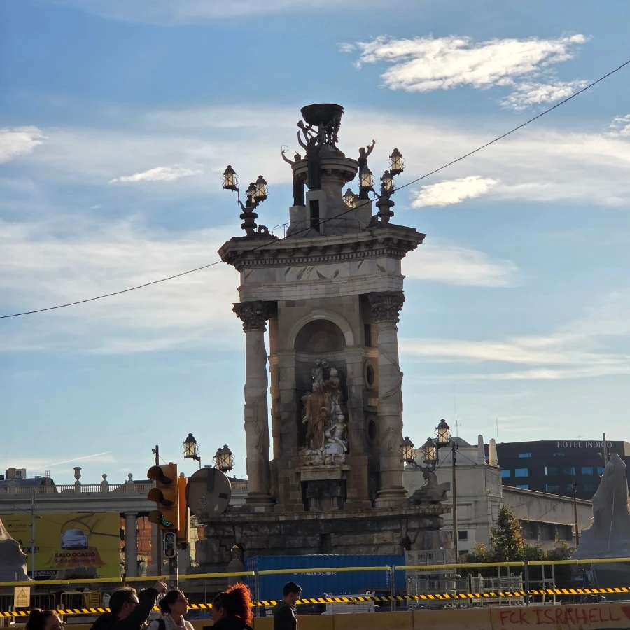 몬세라트에서 돌아온 우리는 에스파냐 역에 도착했다. 역을 빠져나오니, 멋진 구름을 배경으로 분수대가 있다. 여기도 부분 공사가 진행 중인 모양이다. 옆을 돌아다보니 범상치 않은 붉은 건물이 보인다.