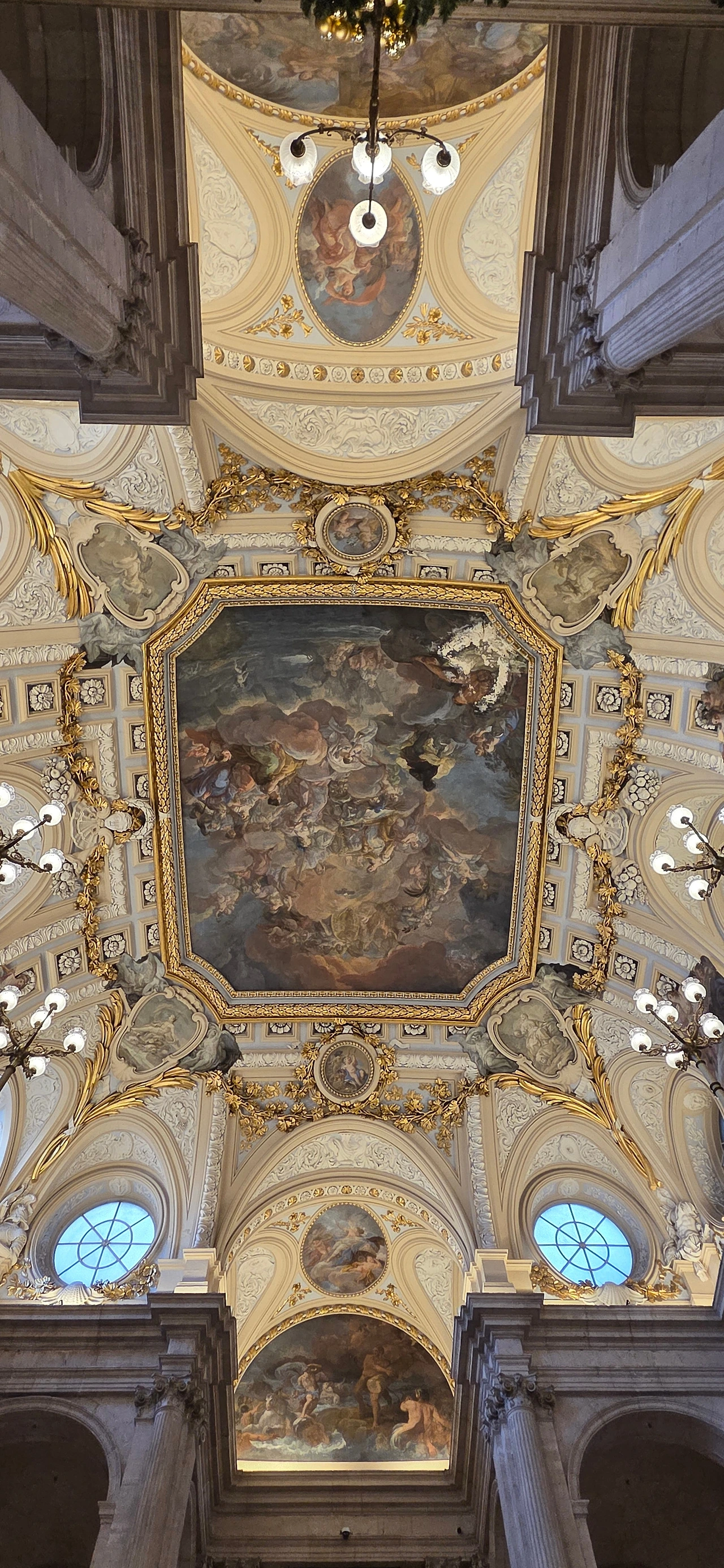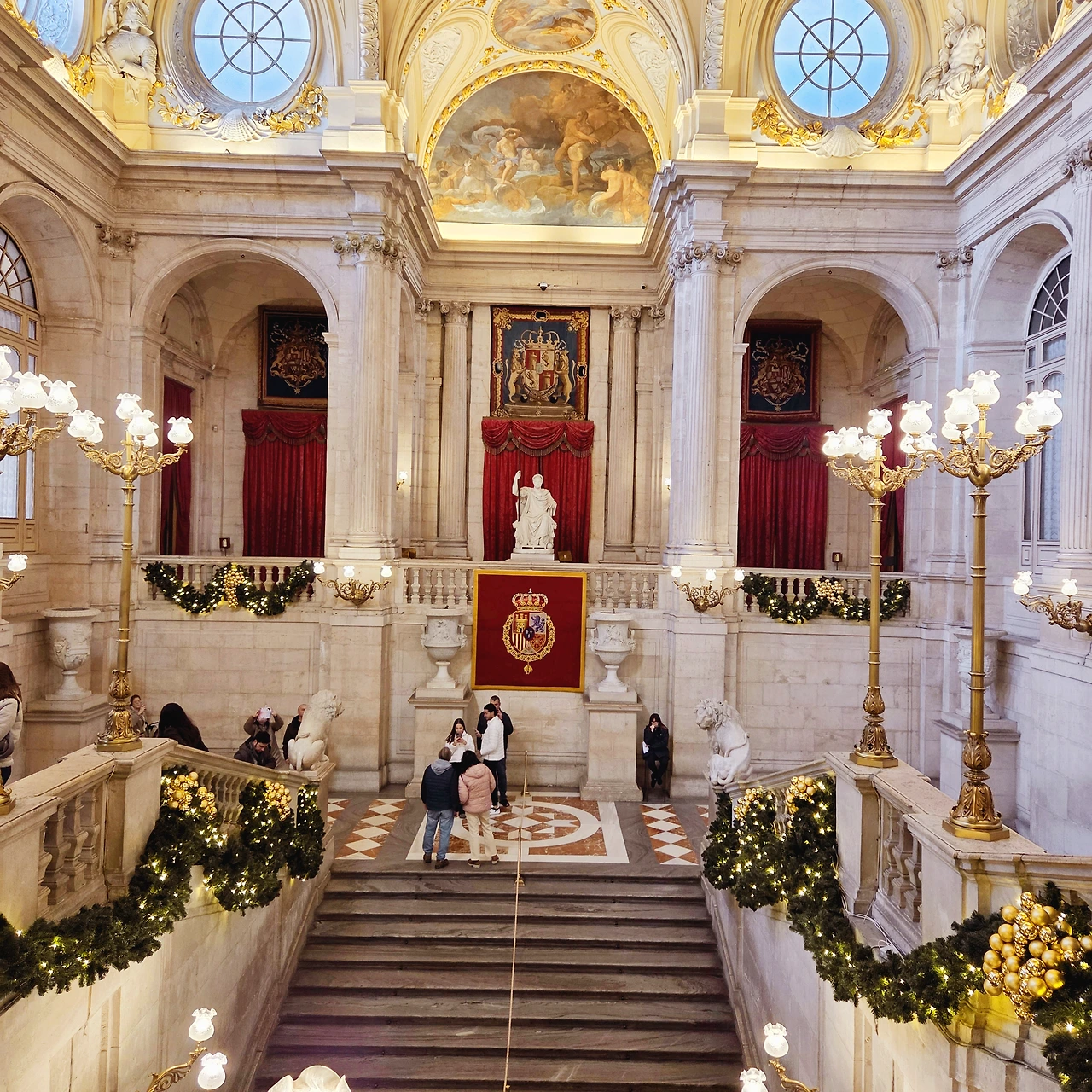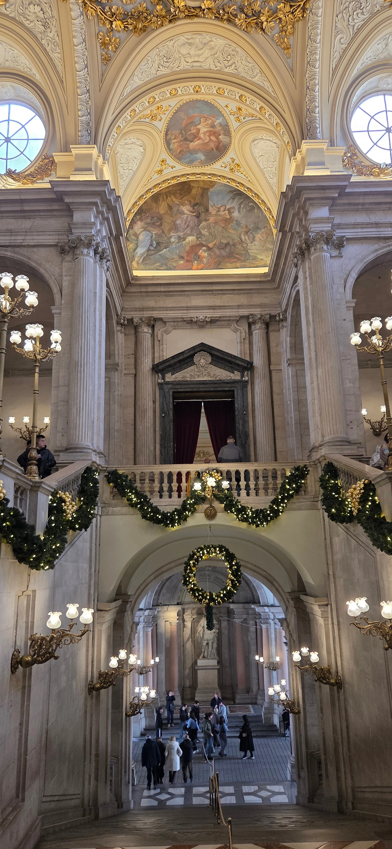 입구에 들어서면 '프란체스코 사바티니(Francesco Sabatini)'가 설계한 거대한 중앙 계단이 있다. 넓고 완만한 대리석 계단이 위층으로 이어지고, 고개를 들면 '코라도 자퀸토(Corrado Giaquinto)'의 거대한 천장화가 펼쳐진다. 천장 전체를 덮은 거대한 프레스코화다. 한 계단 한 계단을 오르는 것이 마치 18세기 스페인 제국의 화려한 역사 속으로 걸어 들어가는 느낌이다.