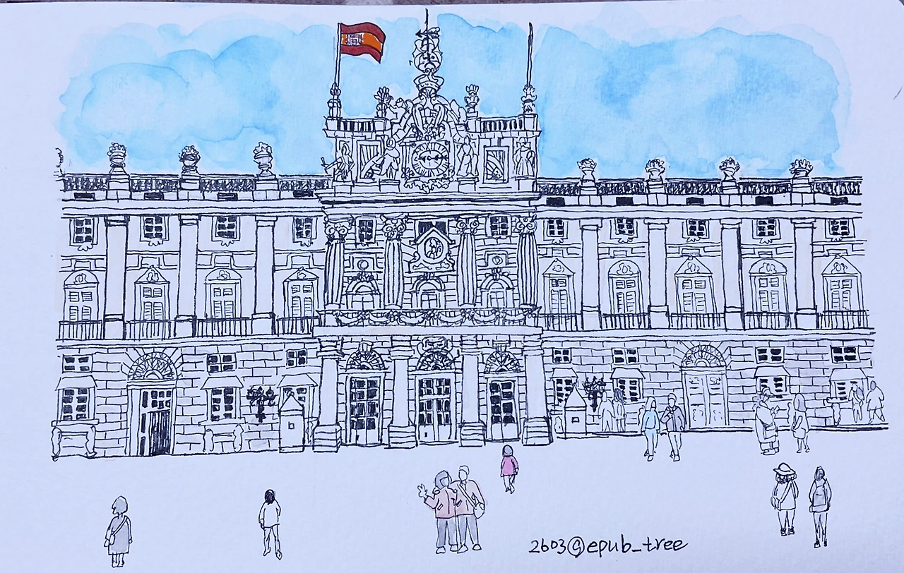 구글맵을 켜고, 마드리드의 골목길들을 걸으며, 특징 있는 건물과 장식들에 대해 남편과 이야기하는 동안 마드리드 왕궁 앞에 도착했다. 휴대폰을 뒤적여 미리 예매해 두었던 온라인 티켓을 꺼내어 줄을 섰다. 10시로 예약해서인지 대기줄이 얼마 없다. 줄도 금방 서고 보안검색도 후딱 마친 후 광장 쪽으로 입장할 수 있었다.