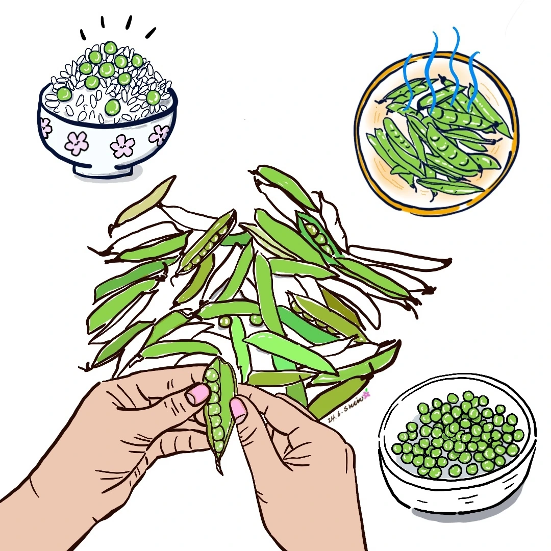 하얀 쌀 위에 연초록 토실토실한 콩알들을 한 움큼 놓는다.