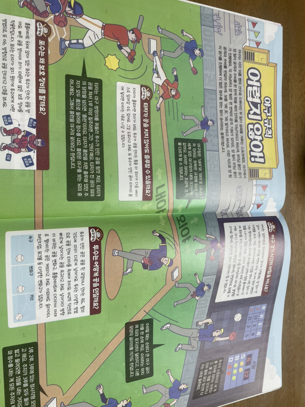 야구는 두 팀이 공격/수비를 번갈아가면서 진행하는 운동입니다. 공격 팀은 공을 쳐서 점수를 얻는 게 목표고 수비 팀은 공격 팀이 점수를 얻지 못하게 하는 것이 목표죠. 이제 타자 (공을 치는 사람)가 공을 치면 그 순간은 1루, 2루, 3루로 이동이 가능합니다. 공격하는 타자가 1/2/3루를 지나 홈으로 오면 1점을 가져가게 됩니다. (투수) 수비수가 친 공을 잡는데요, 거기에서 멀리 날아가는 공을 잡거나 점수가 오르는 것을 막는 수비 역할을 합니다. 제가 설명을 너무 못해서 이해가 잘 안 되신다면 이 사진을 봐주세요. (ㅋㅋ 저도 어이가 없고 갑자기 이해가 안되니까 사진을 보라니 악플 남기셔도 됩니다…ㅋㅋ)